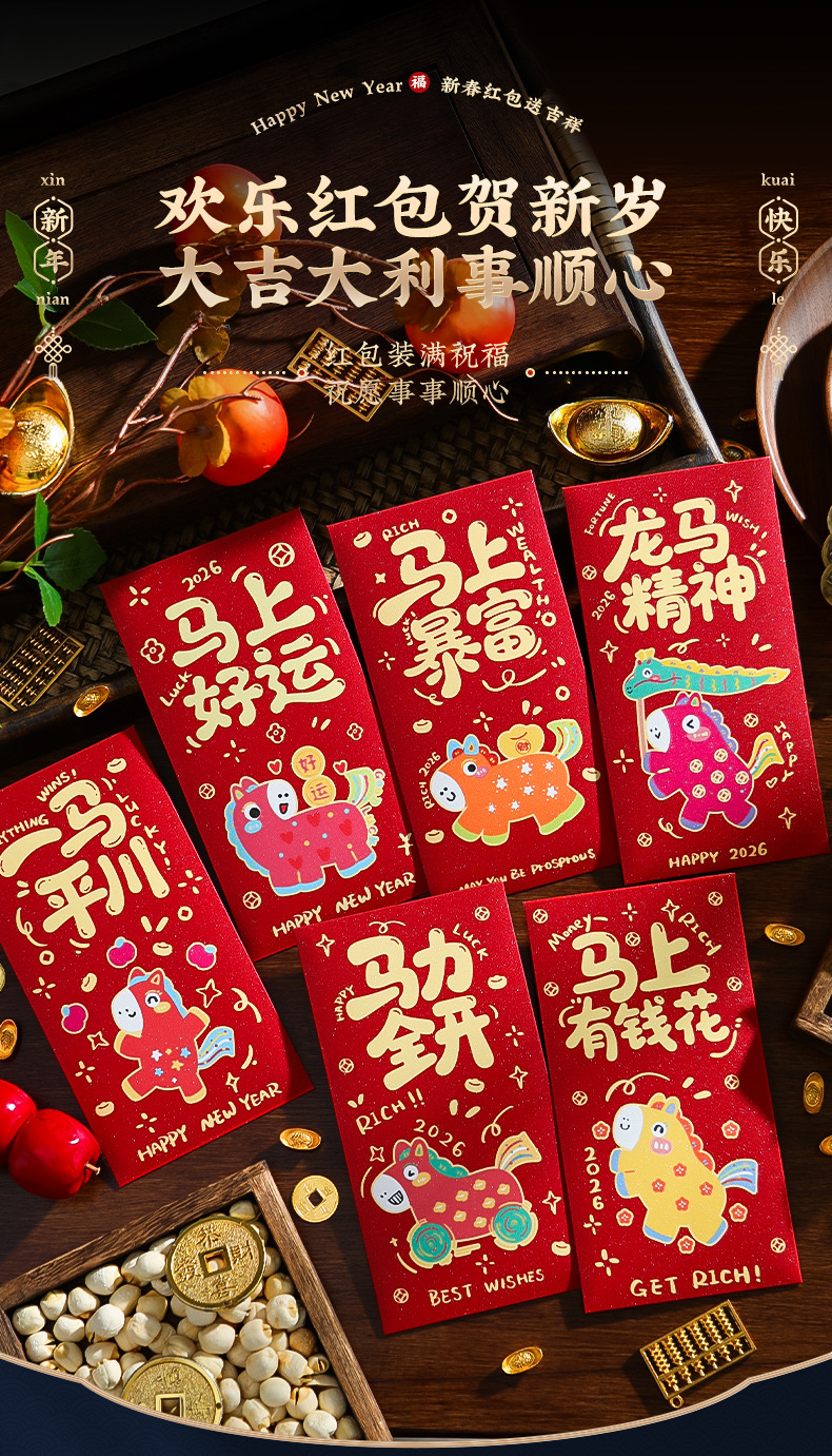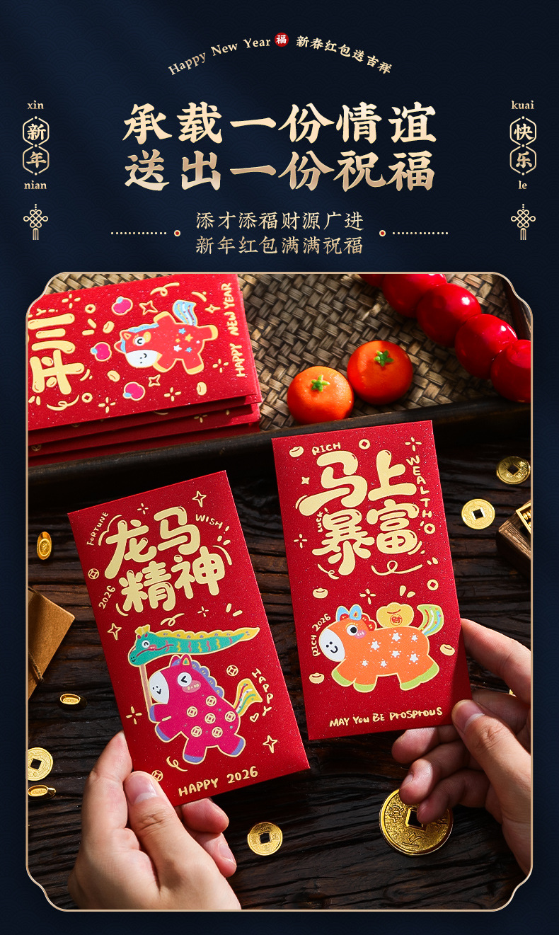 马年红包2026卡通创意新款抖音爆款新年利是封红包袋批发可印Logo批发马年红包2026创意新年利是封千元抖音爆款红包袋红包封利事封