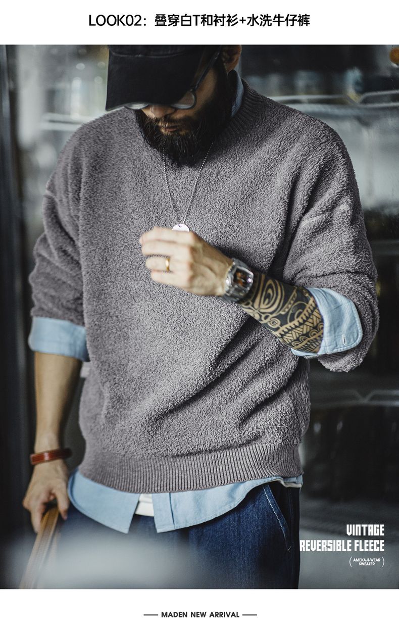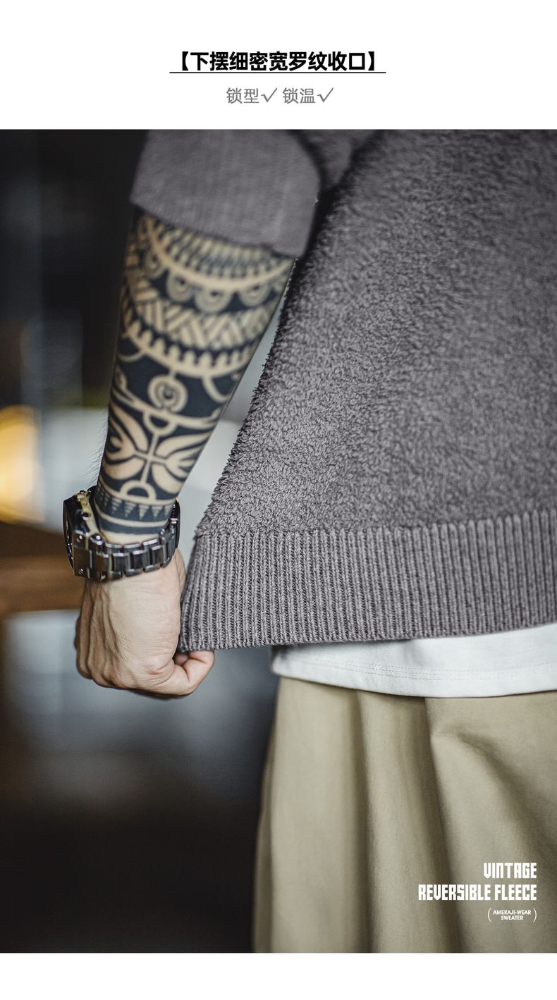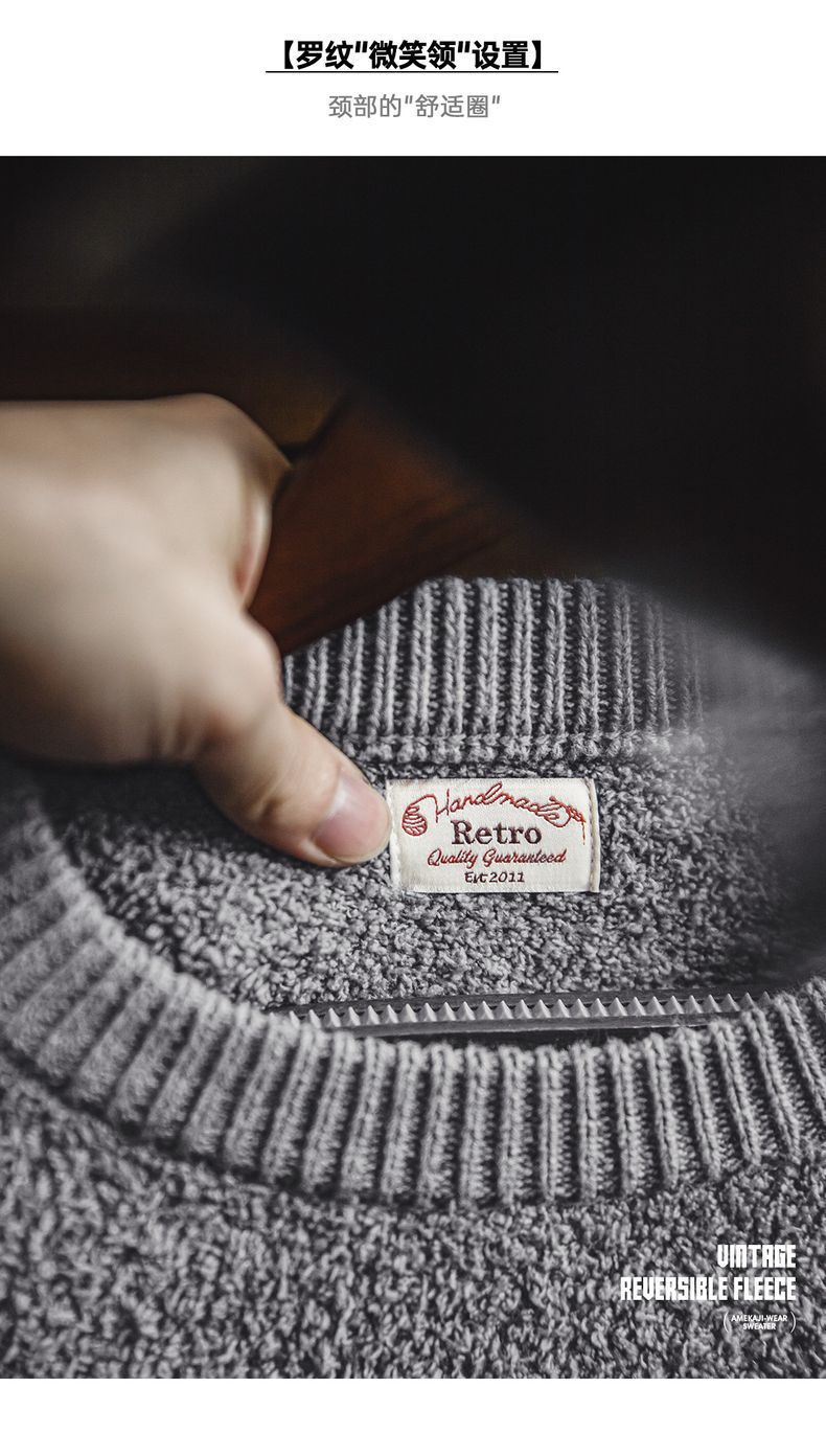 工装优选美式复古半边绒圆领毛衣慵懒风套头灰色加绒保暖上衣男秋