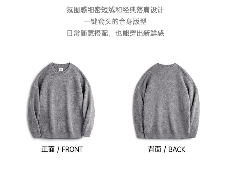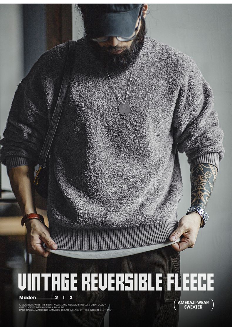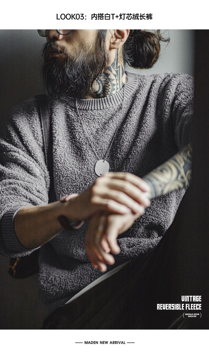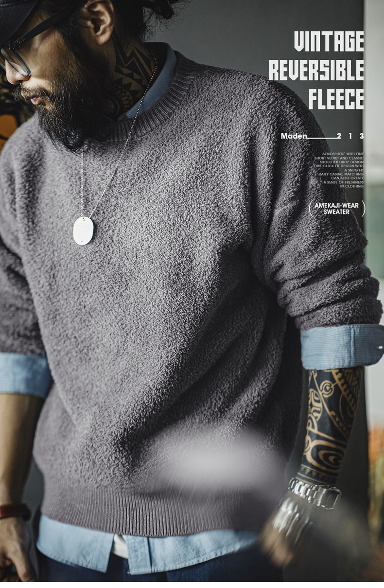 工装优选美式复古半边绒圆领毛衣慵懒风套头灰色加绒保暖上衣男秋