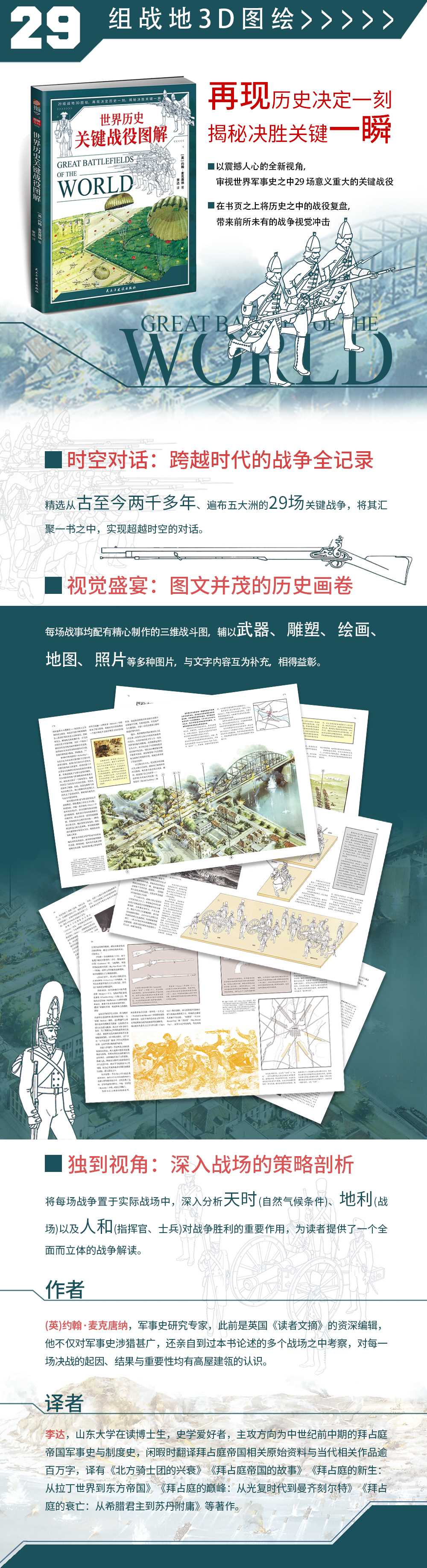 本书通过战争的视角,深入探讨了历史洪流中的29场关键性战役。从公元前3世纪的坎尼之战,到20世纪的现代战争,本书跨越了千年时光,覆盖了战争史上的多个重要时刻,包括色当战役、小大角河之战、乌姆杜尔曼之战和阿拉曼战役等,这些战役都在历史的转折点上扮演了决定性的角色。书中*选的每一个战场案例,不仅具有强烈的戏剧性,更承载着深远的历史意义。为了使读者能够更直观地理解每场战役,作者特别设计了三维战斗图,将地形、部队部署、天气等关键因素融入模型之中。无论是阿纳姆上空的伞兵降落,还是布伦海姆战场上的泥泞斗争,读者都能通过这些精心制作的视角,洞察战争行动的每一个关键瞬间。