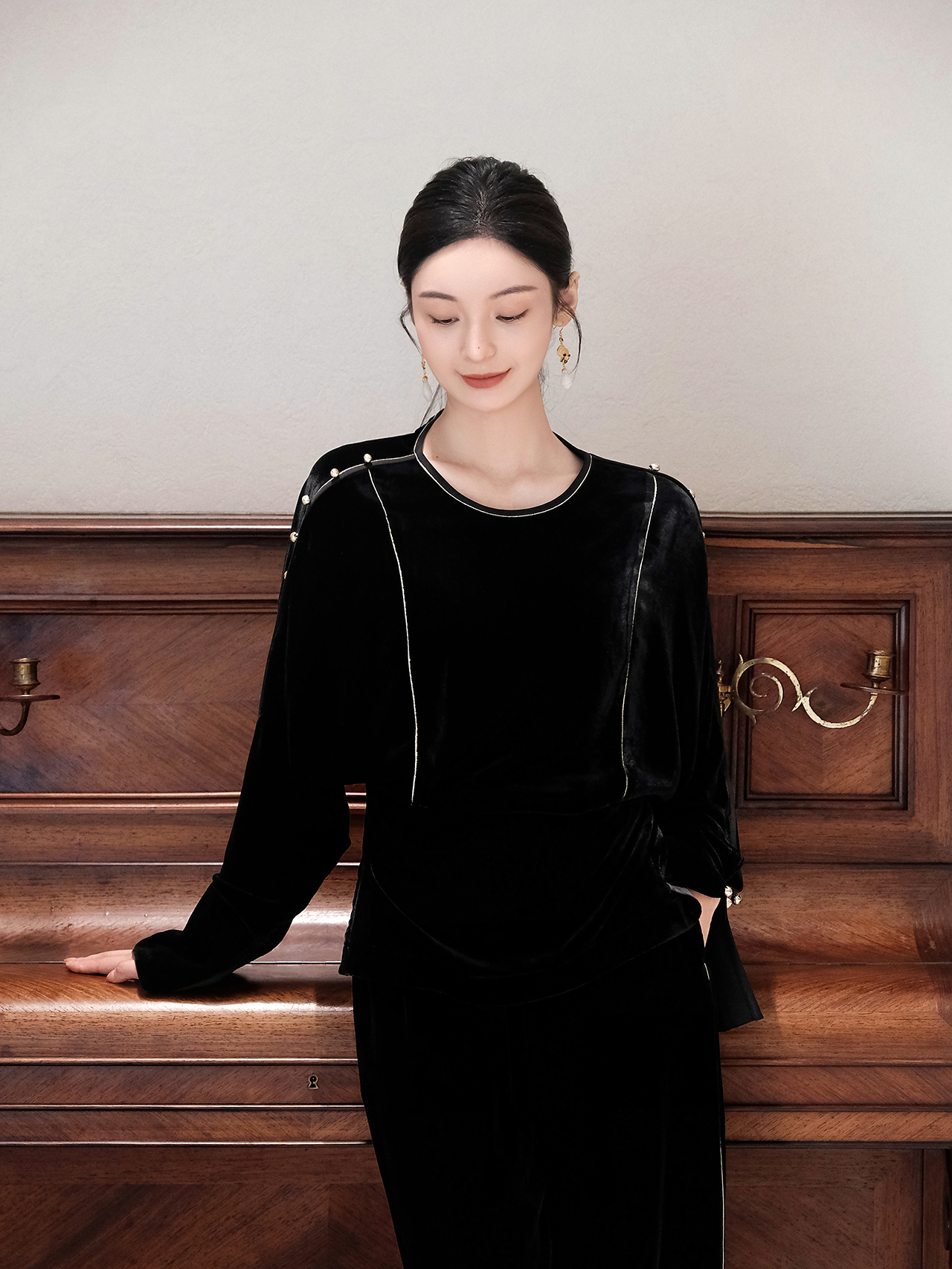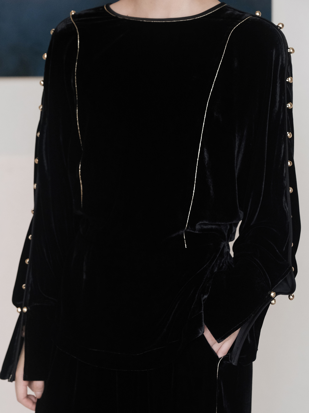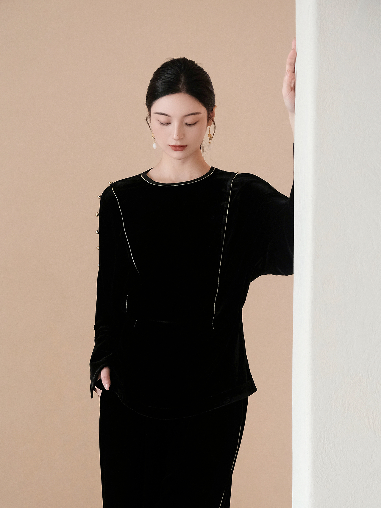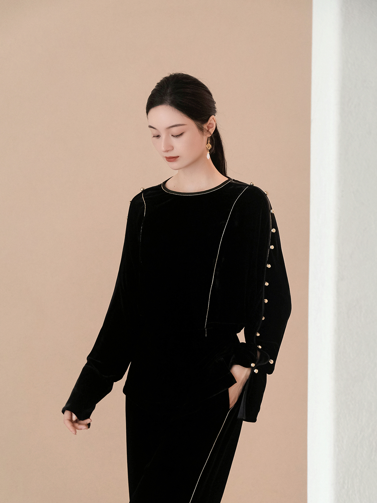 盛唐婧| 重磅真丝绒落肩轻奢设计款上衣