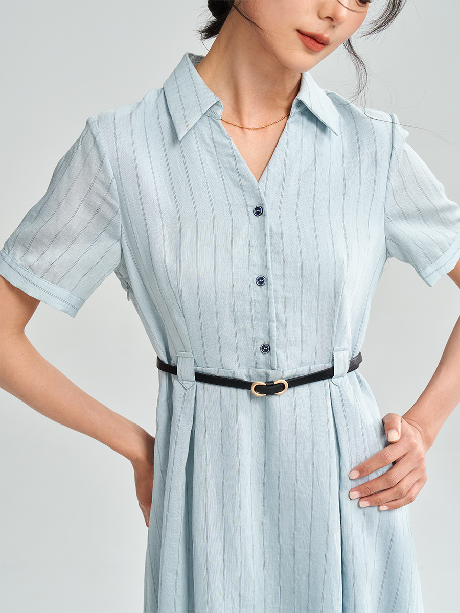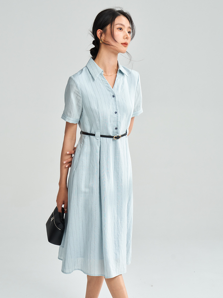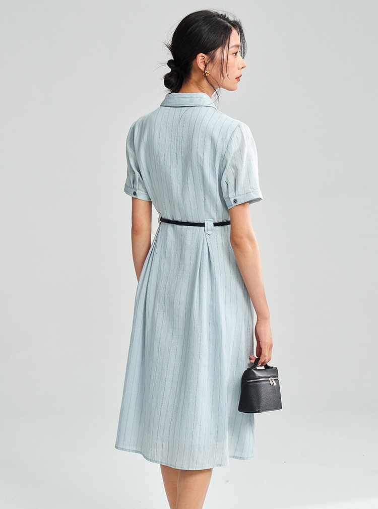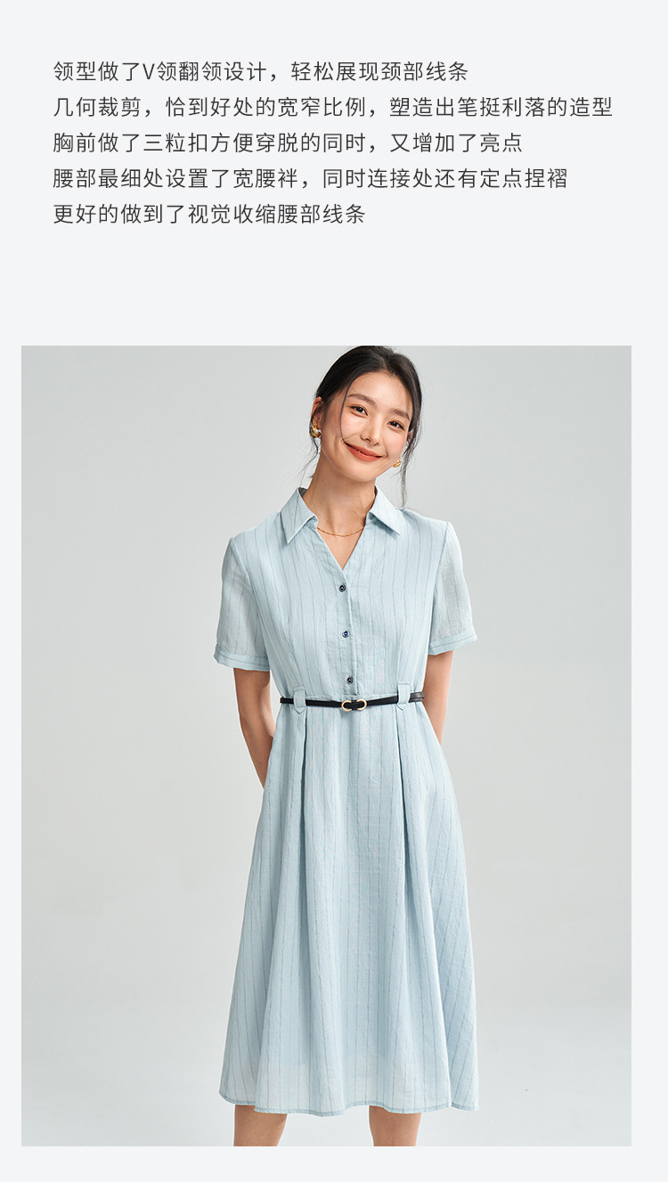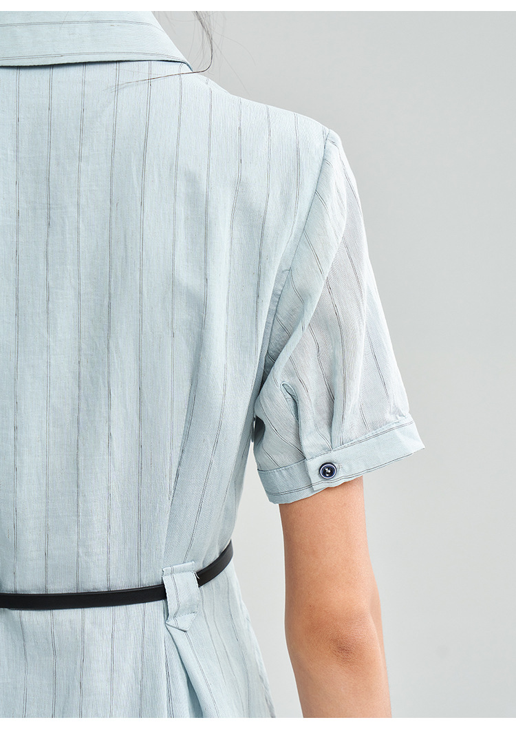 品牌同步亚麻棉OL知性条纹收腰显瘦通勤衬衫连衣裙
