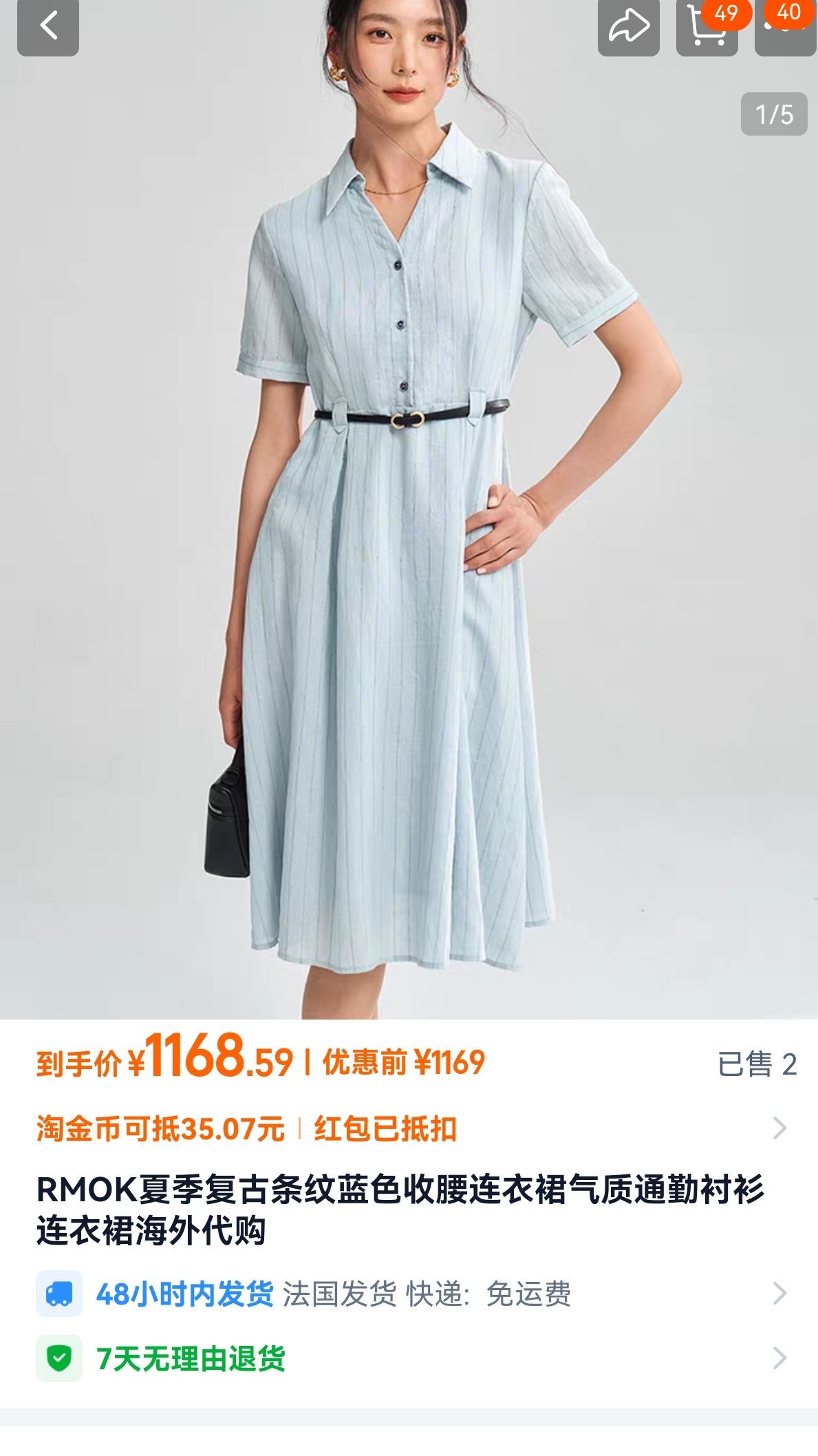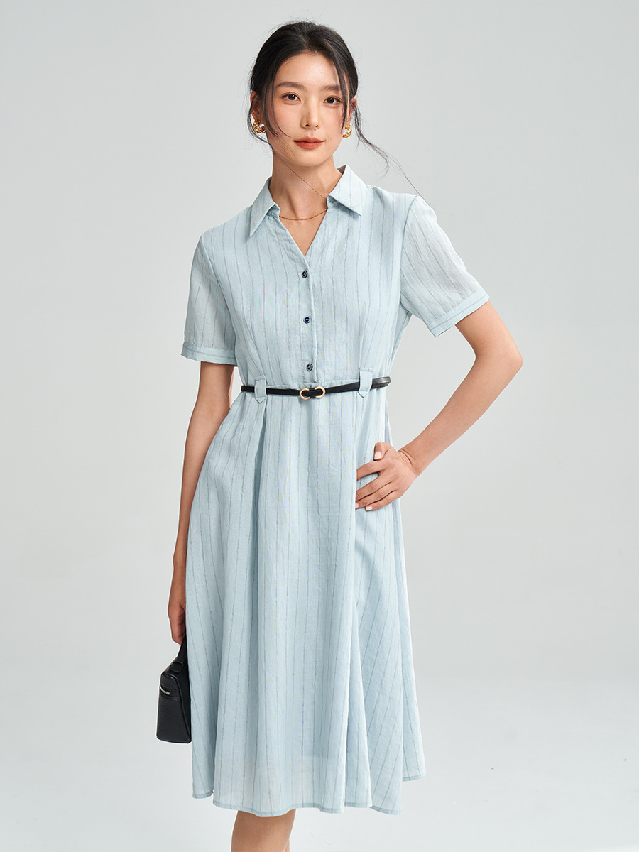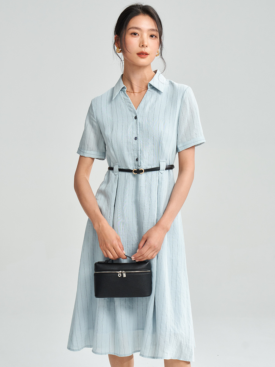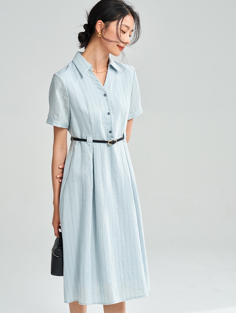 品牌同步亚麻棉OL知性条纹收腰显瘦通勤衬衫连衣裙