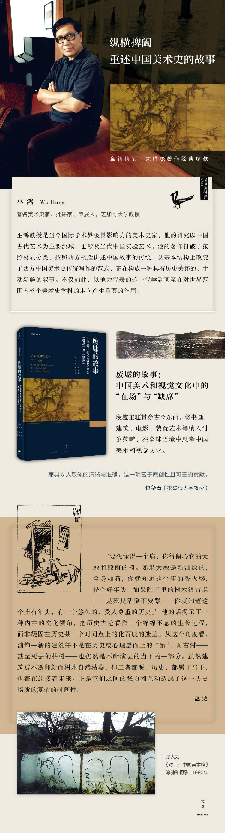 废墟主题,纵横捭阖,探讨中国艺术从古代到当代的实践与经验,领域横跨绘画、建筑、摄影、印刷品和电影,并与西方艺术参照并观,令人眼界大开。《废墟的故事:中国美术和视觉文化中的“在场”与“缺席”》不仅对于中国美术与视觉文化是一次富于雄心的思辨,对于全球语境下的艺术研究同样是一项里程碑式的贡献。