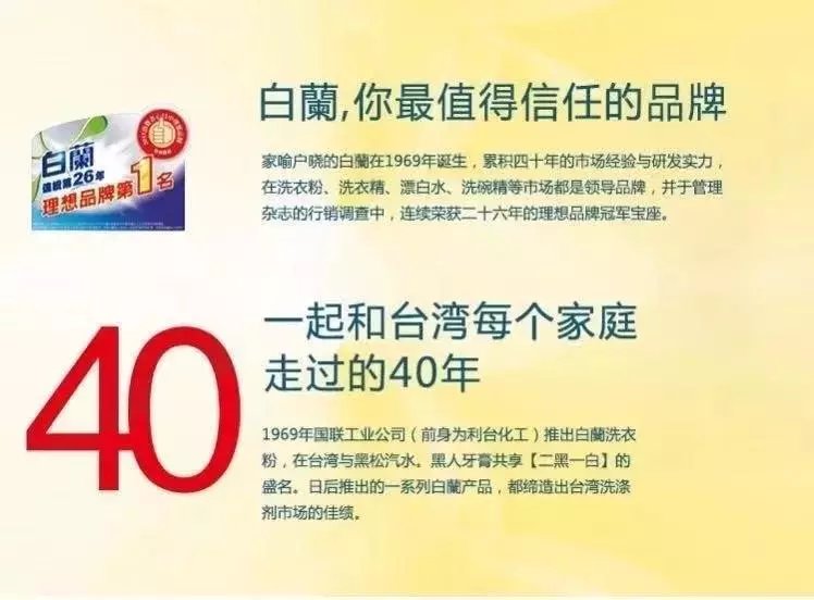 白蘭这个品牌在我国台湾早已家喻户晓,是台湾的全民品牌,在台湾有40多年的历史。