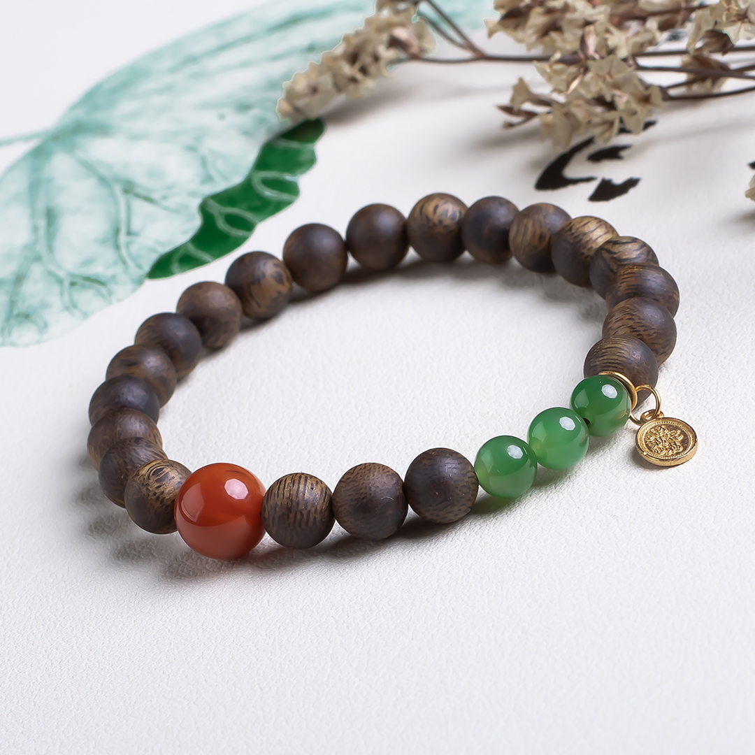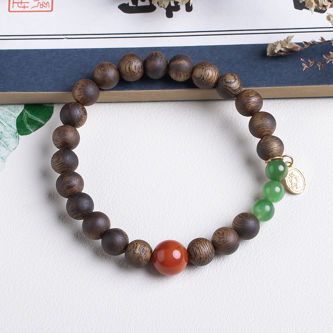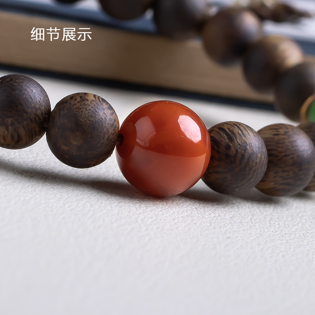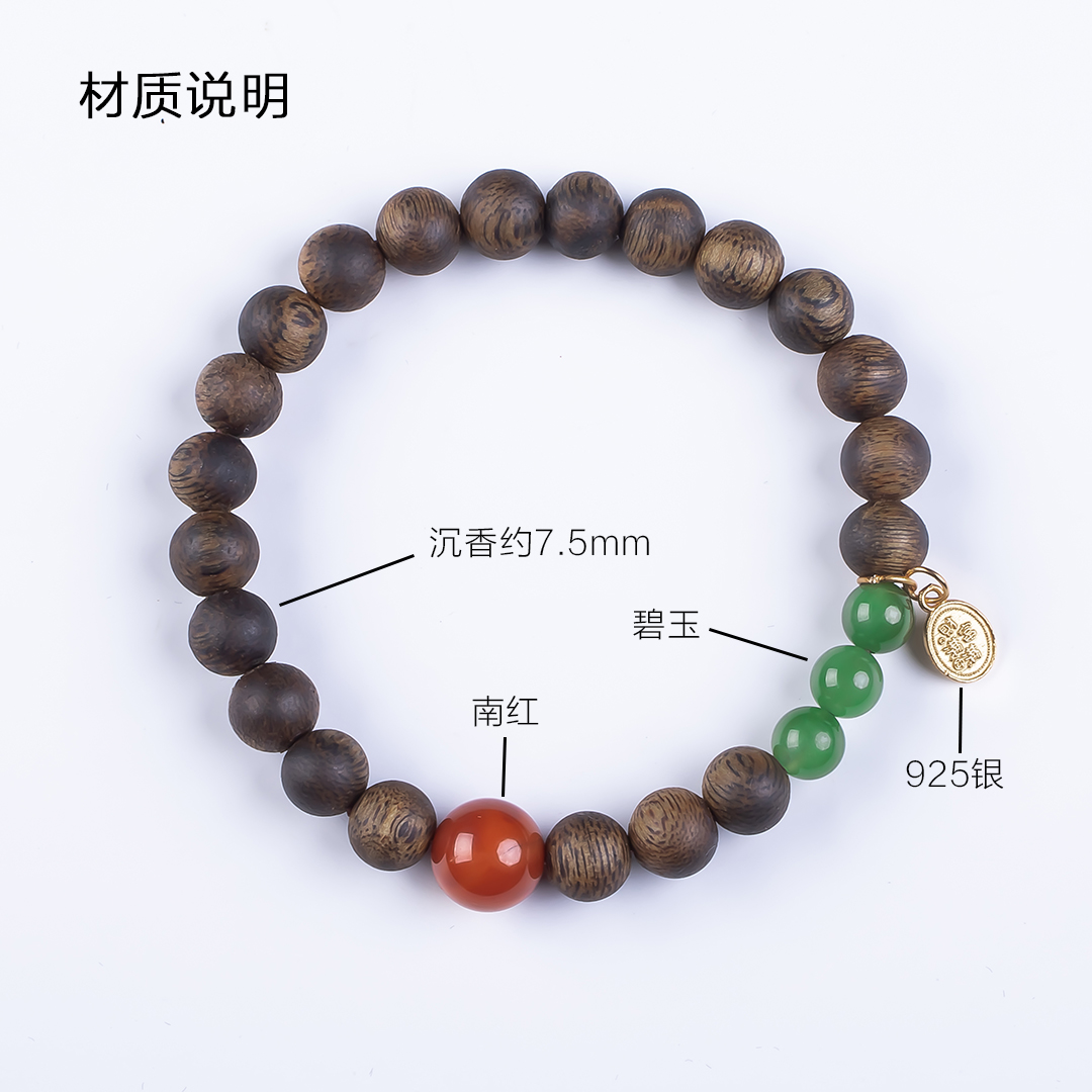xy0506沉香+南红碧玉平安多财手串,天然沉香约7.5mm,原色原味,香味自然清甜,一颗满色肉南约圆珠,三颗满色碧玉相连,搭一枚平安多财提溜小坠,国风款式设计,上手优雅大方。