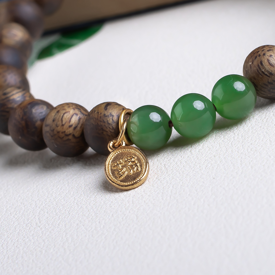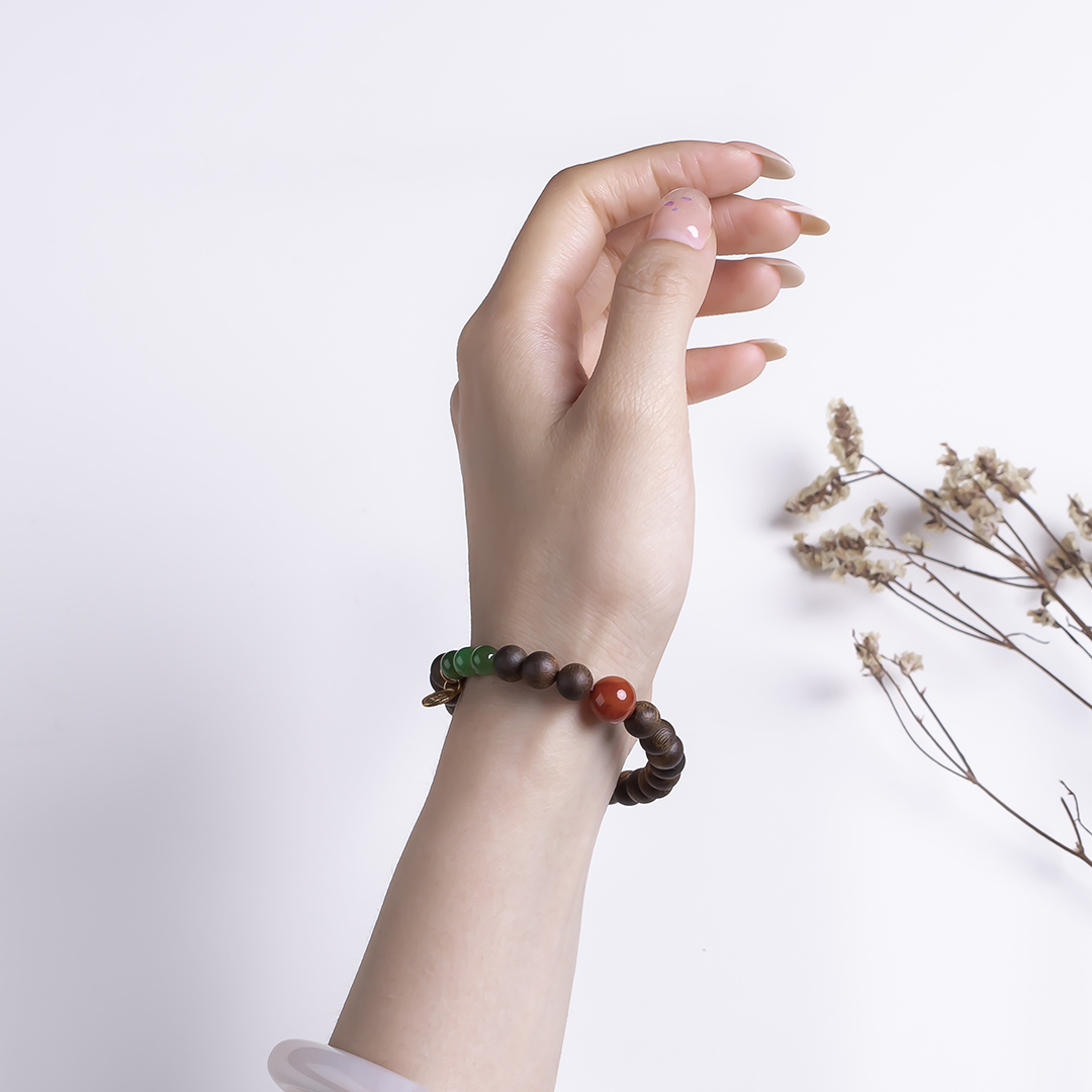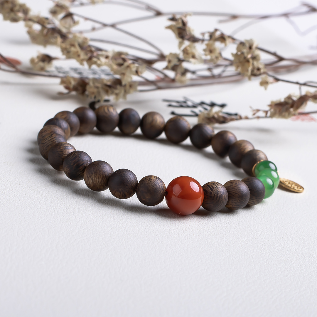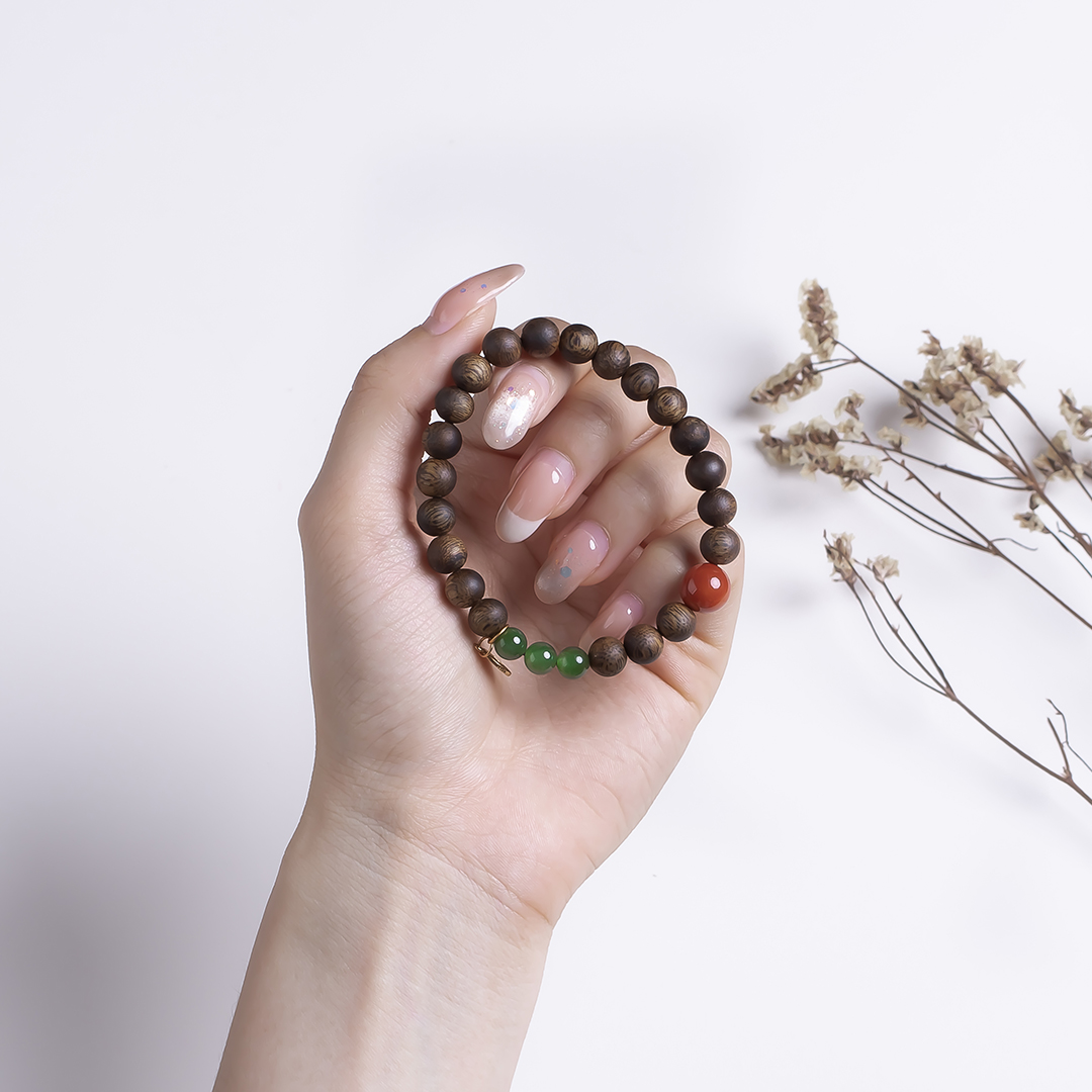 xy0506沉香+南红碧玉平安多财手串,天然沉香约7.5mm,原色原味,香味自然清甜,一颗满色肉南约圆珠,三颗满色碧玉相连,搭一枚平安多财提溜小坠,国风款式设计,上手优雅大方。