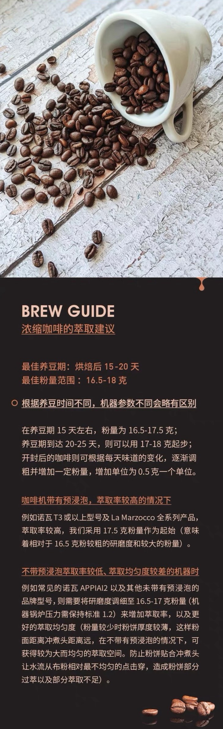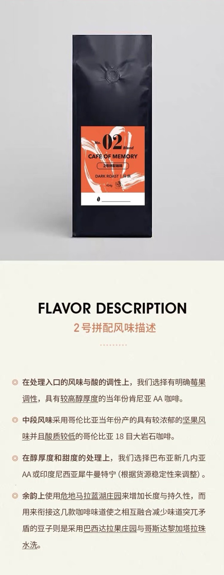 2号拼配咖啡豆用的是肯尼亚AA、哥伦比亚18目大岩石、巴布亚新几内亚AA(根据季节及豆子品质稳定性也会采用印度尼西亚犀牛曼特宁)、危地马拉蓝湖庄园、巴西达拉果庄园、哥斯达黎加塔拉珠水洗。这款是深度烘焙,所以香气饱满浓郁,带些许莓果风味,酸度适中,甜度较高,口感平衡度高,我个人比较喜欢,也是沈涛常喝!