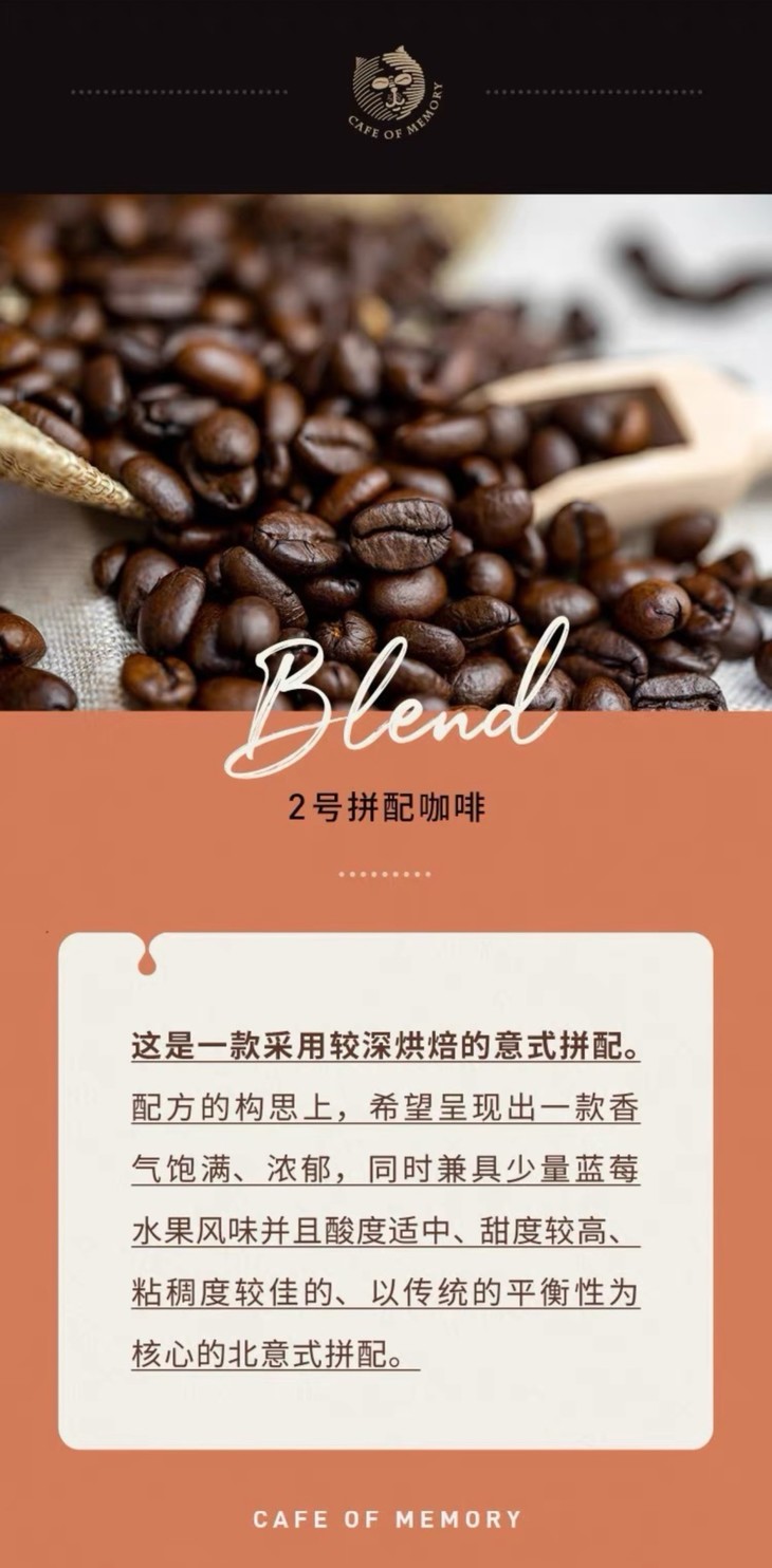 前几天发了杯鸡血咖啡,好多人求沈涛用的豆子,这油脂,确实也是太丰富了!其实就是之前上过的2号拼配啊啊啊,Cafe of memory,他师傅自己烘的,因为买的人少,我就下架了,那就,再复活下吧,喜欢自己用豆子磨的,真的极推荐,喝过的老粉肯定知道有多专业啦,优秀!