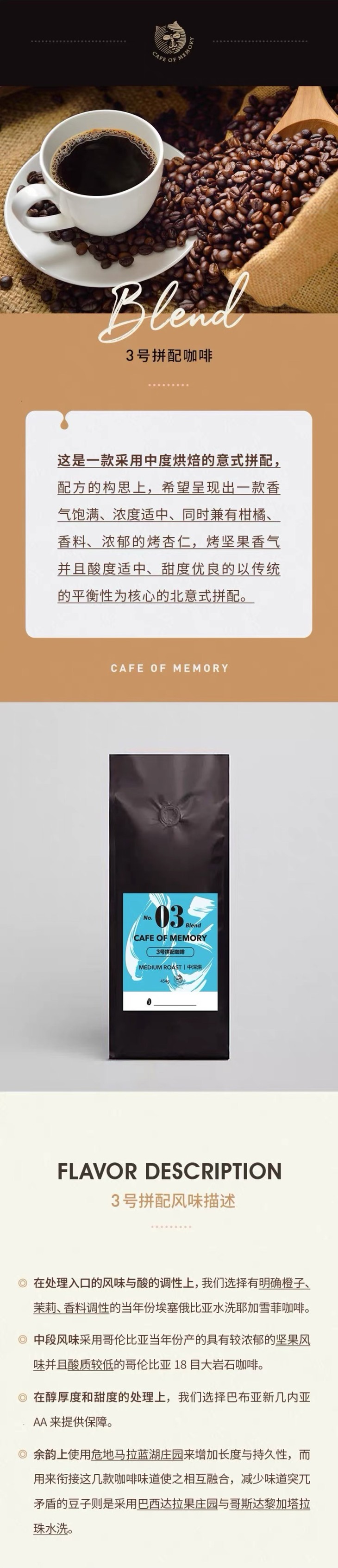 市面上大家能买到的意式拼配咖啡豆大多比较常规,无外乎大家很熟悉的那几种,像是哥伦比亚、哥斯达黎加、危地马拉和曼特宁四个地方的咖啡豆。但是Cafe of memory是尘箱根据多年烘焙经验和不断的调试自己研发出来的比例,都用世界各地的优质咖啡豆,因为品种以及水洗和烘焙程度的不同,所以咖啡豆的大小、形状、颜色也有点不一样,但是真的很香,一打开袋子就忍不住嘴角上扬!