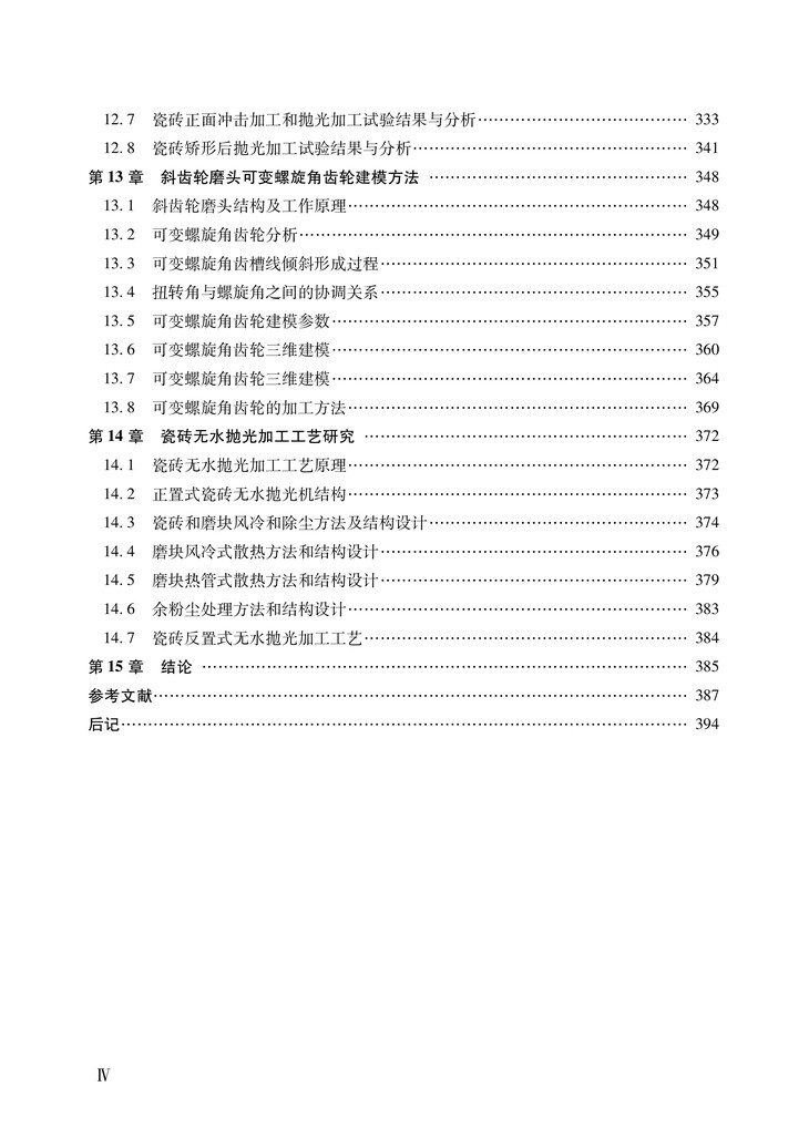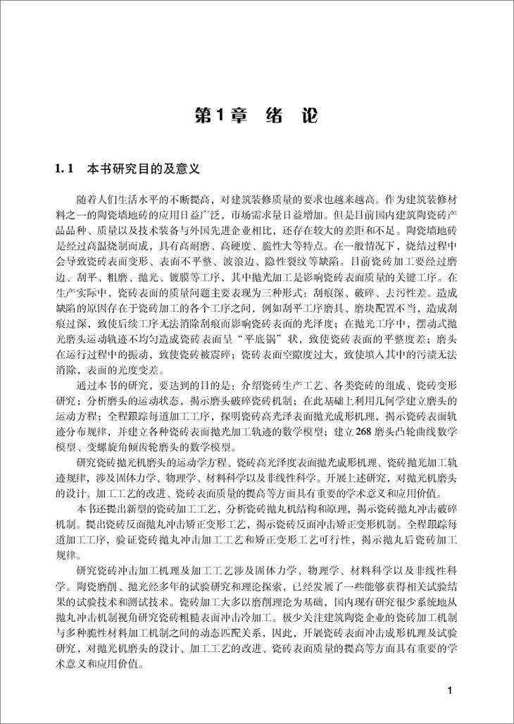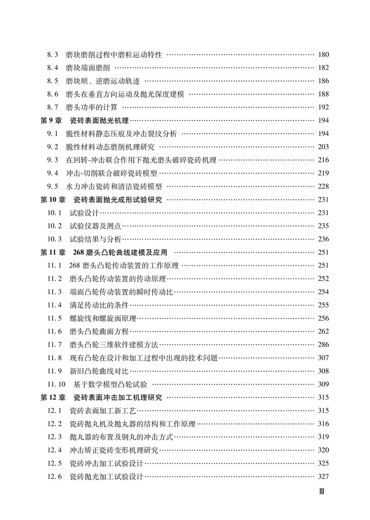 本书在研究瓷砖工艺的基础上,创新性地提出并建立5种不同瓷砖加工轨迹;首次提出瓷砖表面冲击加工及矫正变形工艺,建立模型并分析其机理,而且进行了试验研究和应用;首次建立268磨头凸轮曲线模型,并进行产业化应用;首次对COMS磨头中可变螺旋角齿轮进行理论创新,建立该齿轮的数学模型;本书还提出瓷砖无水抛光加工工艺,并设计了该抛光机的结构。
