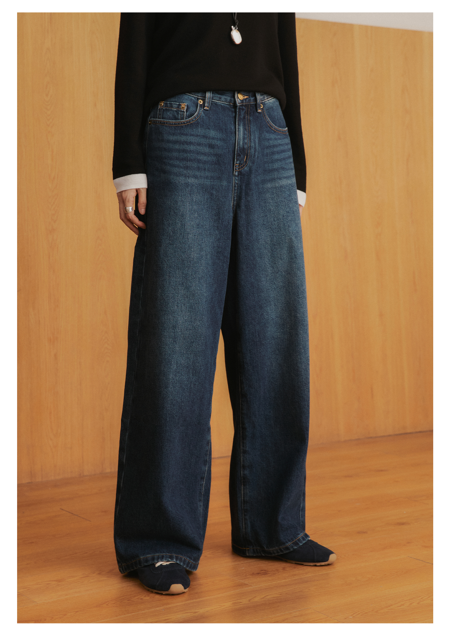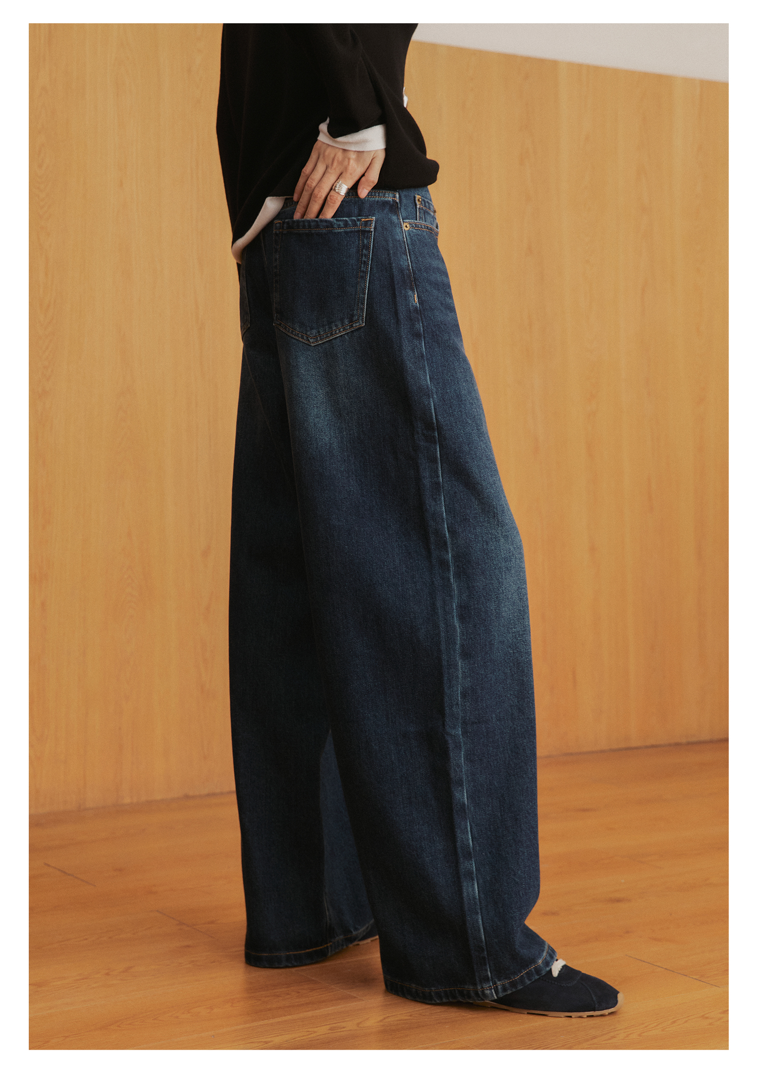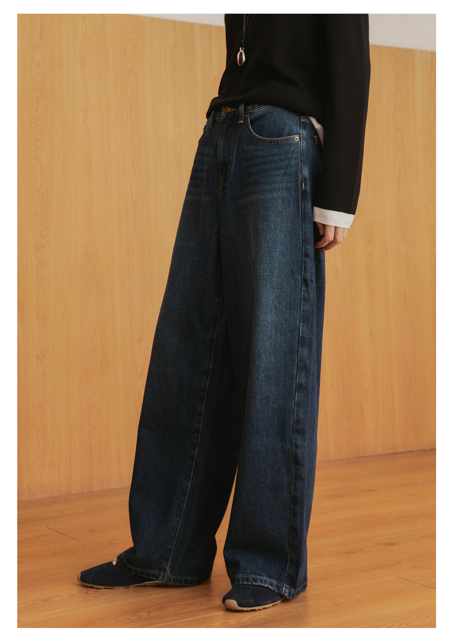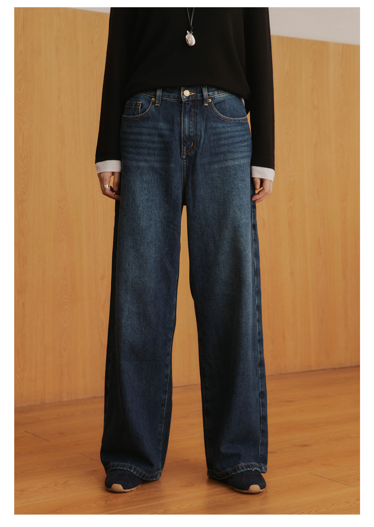 棉仓3561519005-挺括有型厚款磨毛牛仔裤 磨石水洗显瘦复古宽松阔腿牛仔裤