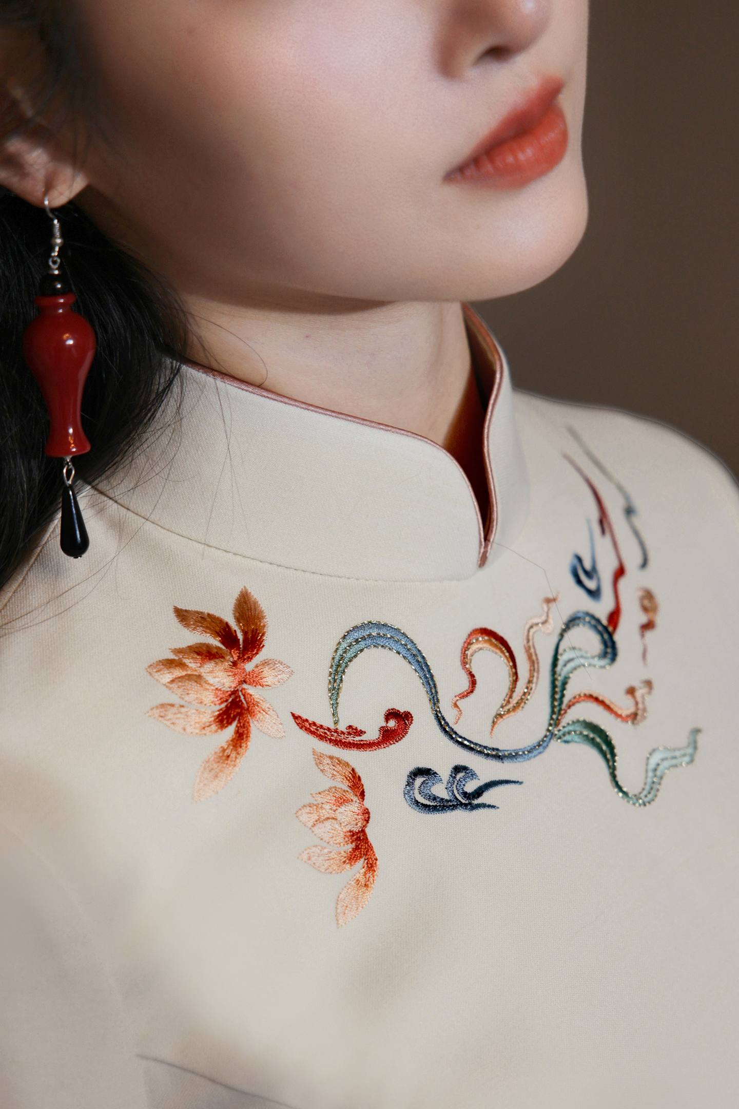 我们参考了整整9套古典的敦煌色谱,采用渐变绣线,把它绣在了心口——朱砂赤、石青蓝、琉璃金、藕荷紫……