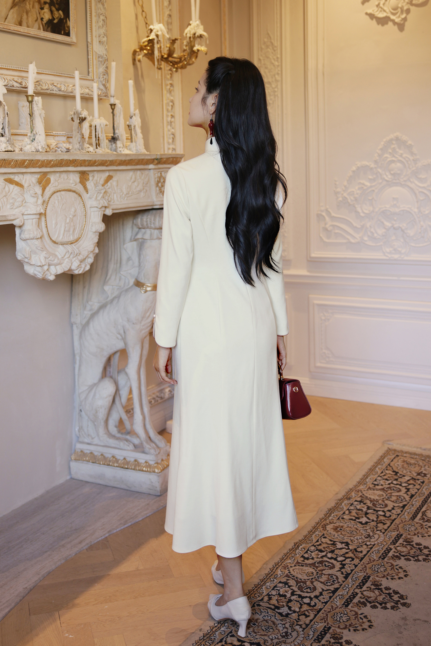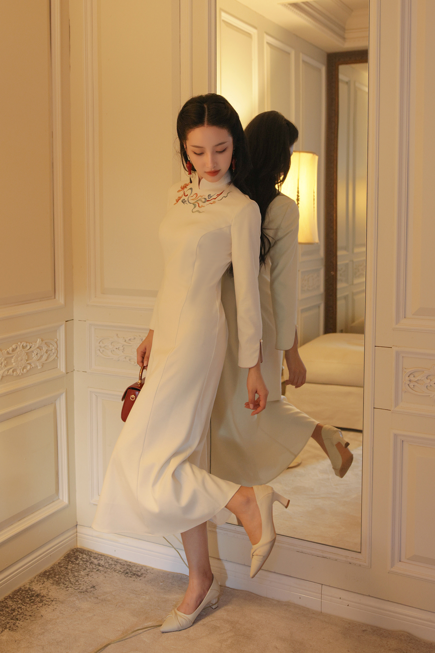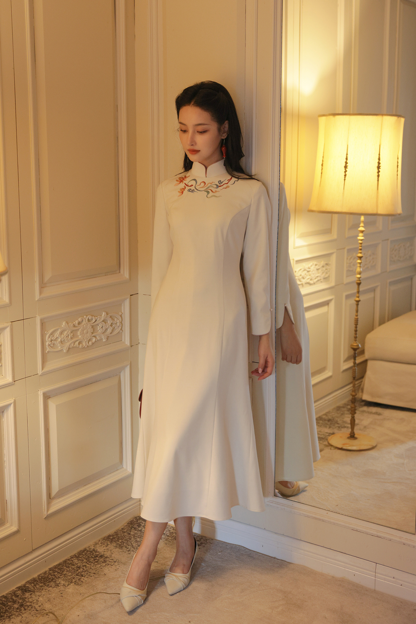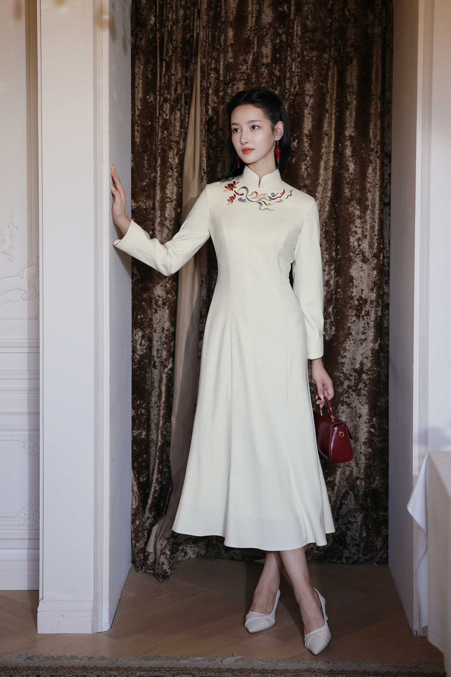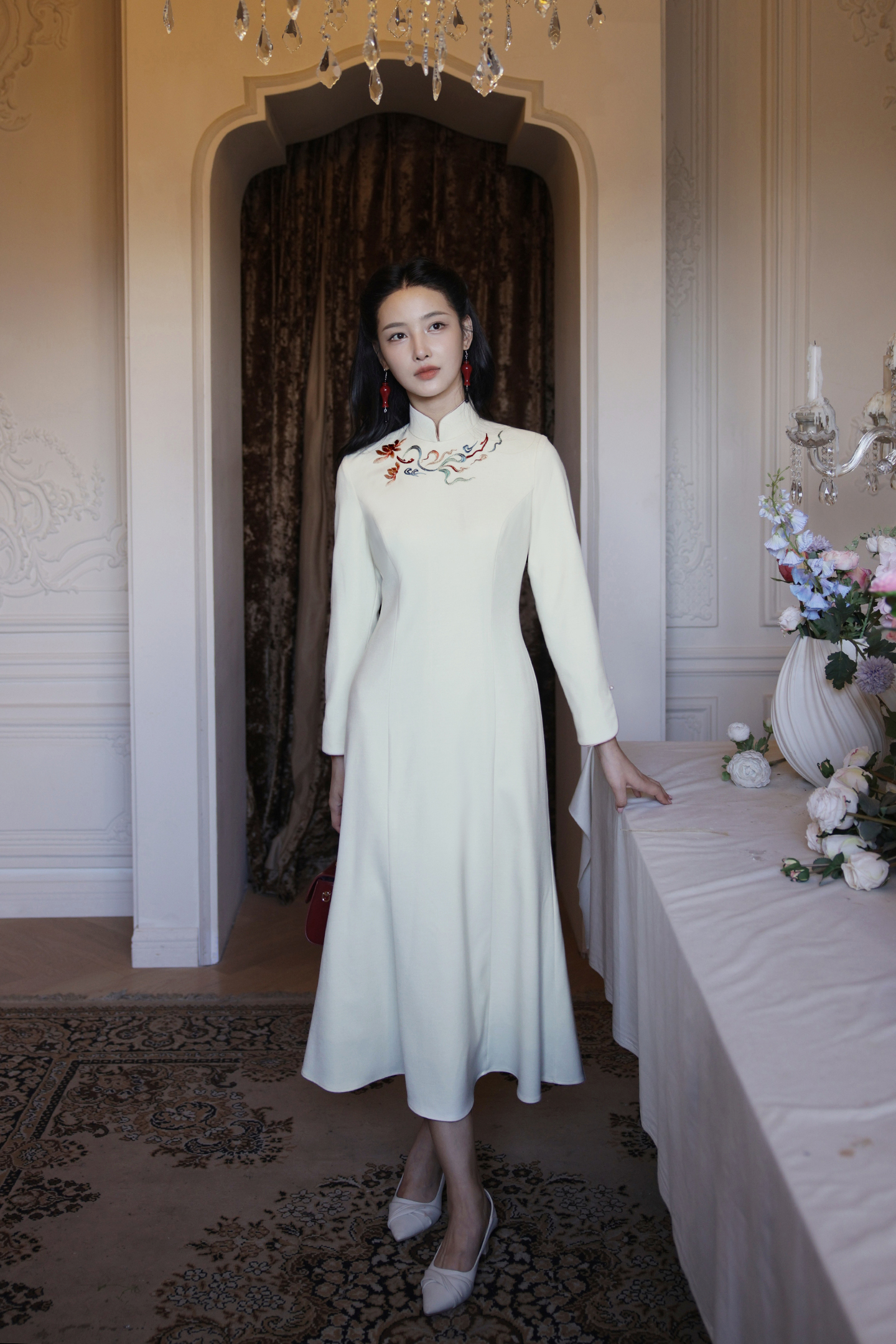 白衣胜雪,裙摆曳地如覆新雪,敦煌刺绣是襟前一片流转的霞光。但冷天怎么穿?我们配了件正红色圆领毛衣开衫,一下子把清冷仙气拉回人间暖意里!