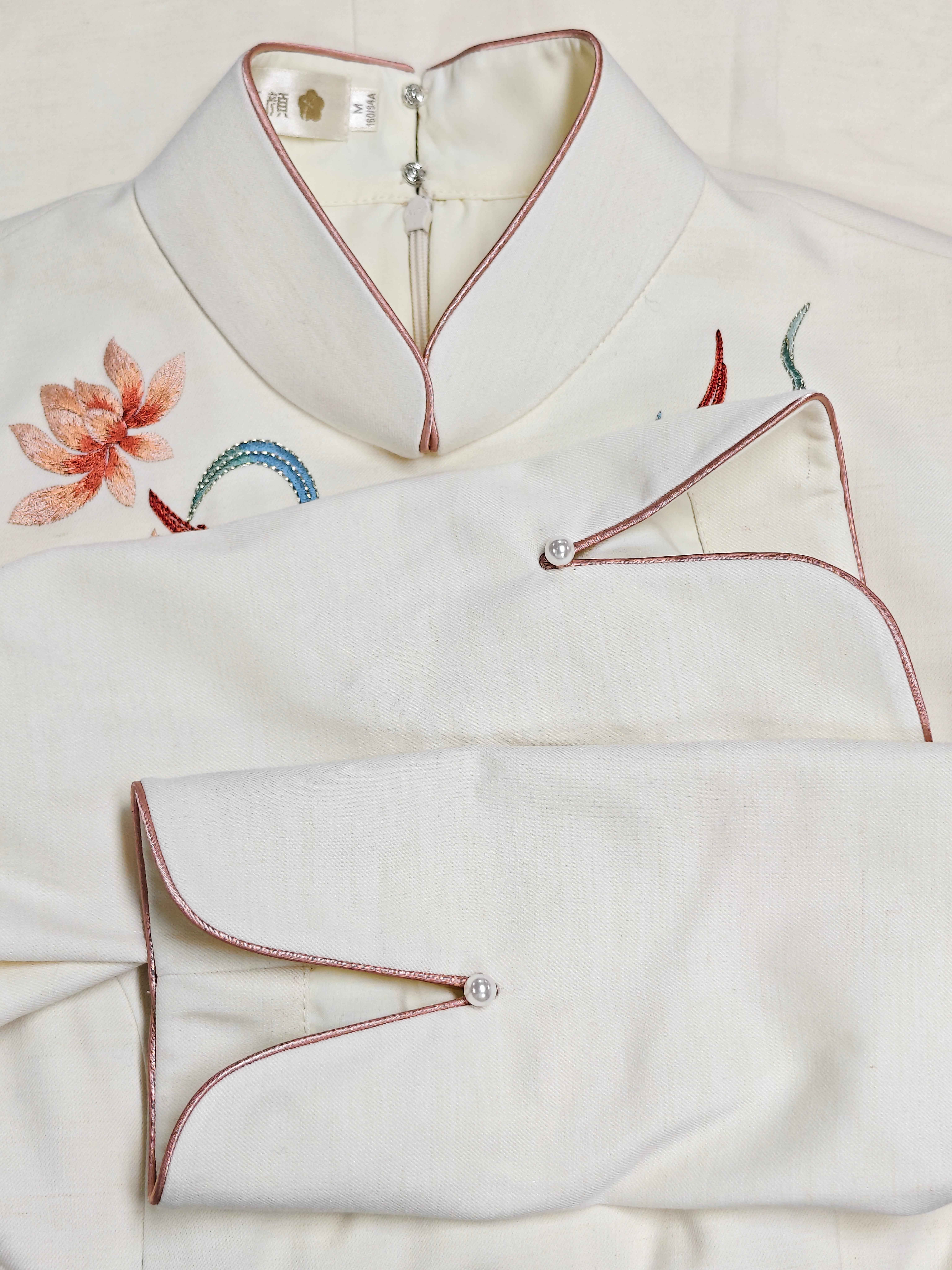 1️⃣ 圆领开衫的领口恰到好处露出旗袍立领,白与红碰撞,明明艳又端庄;