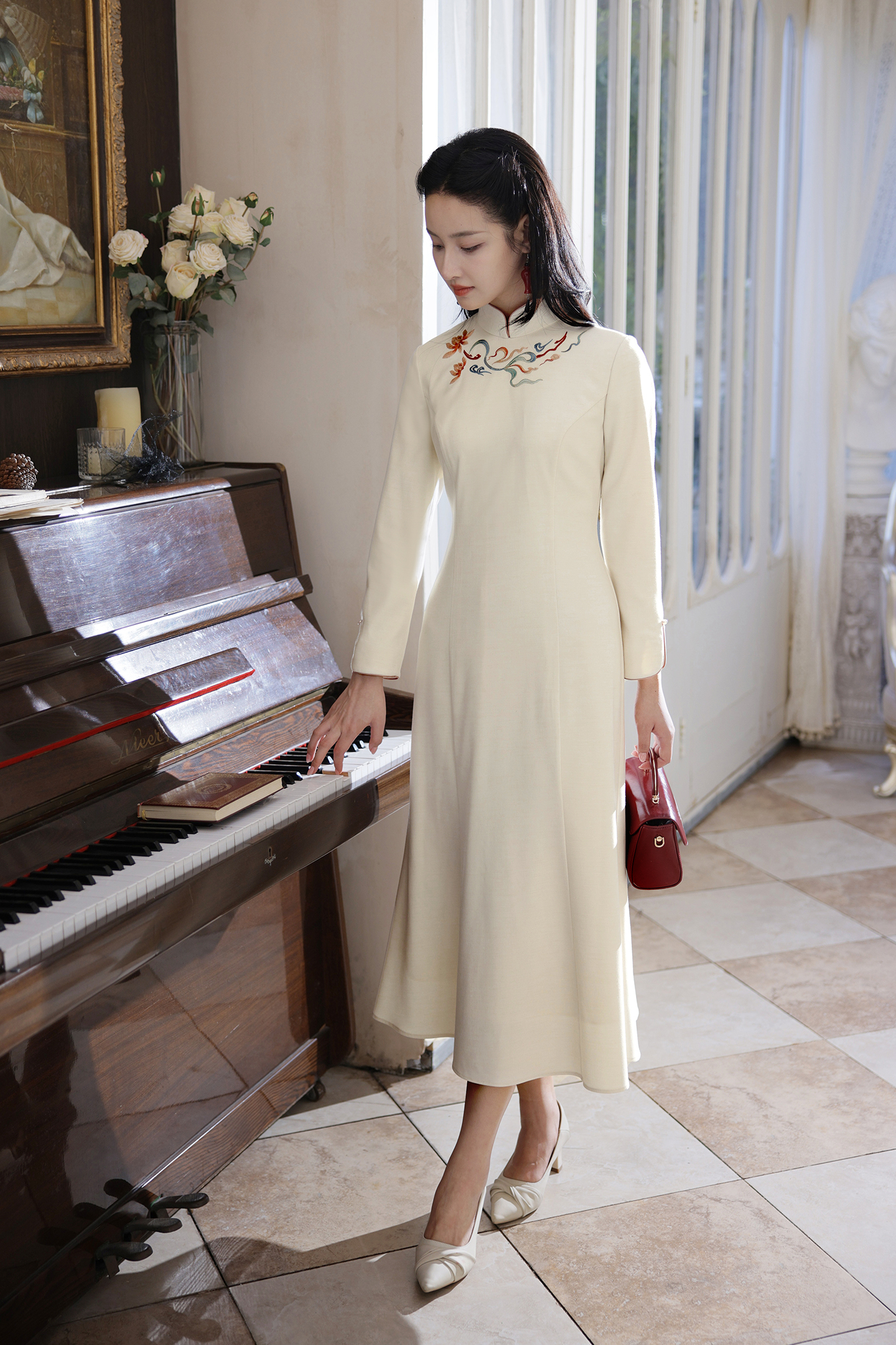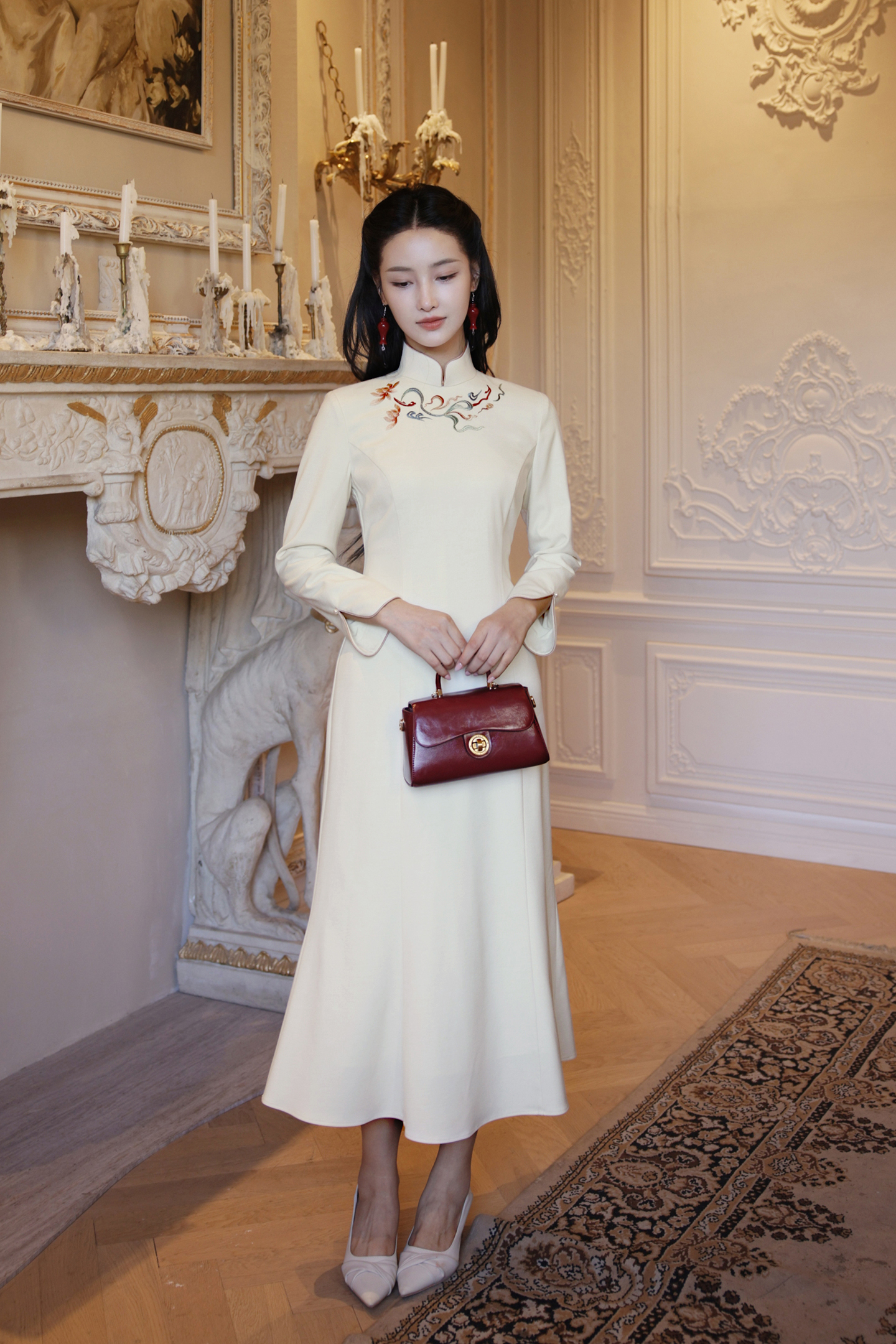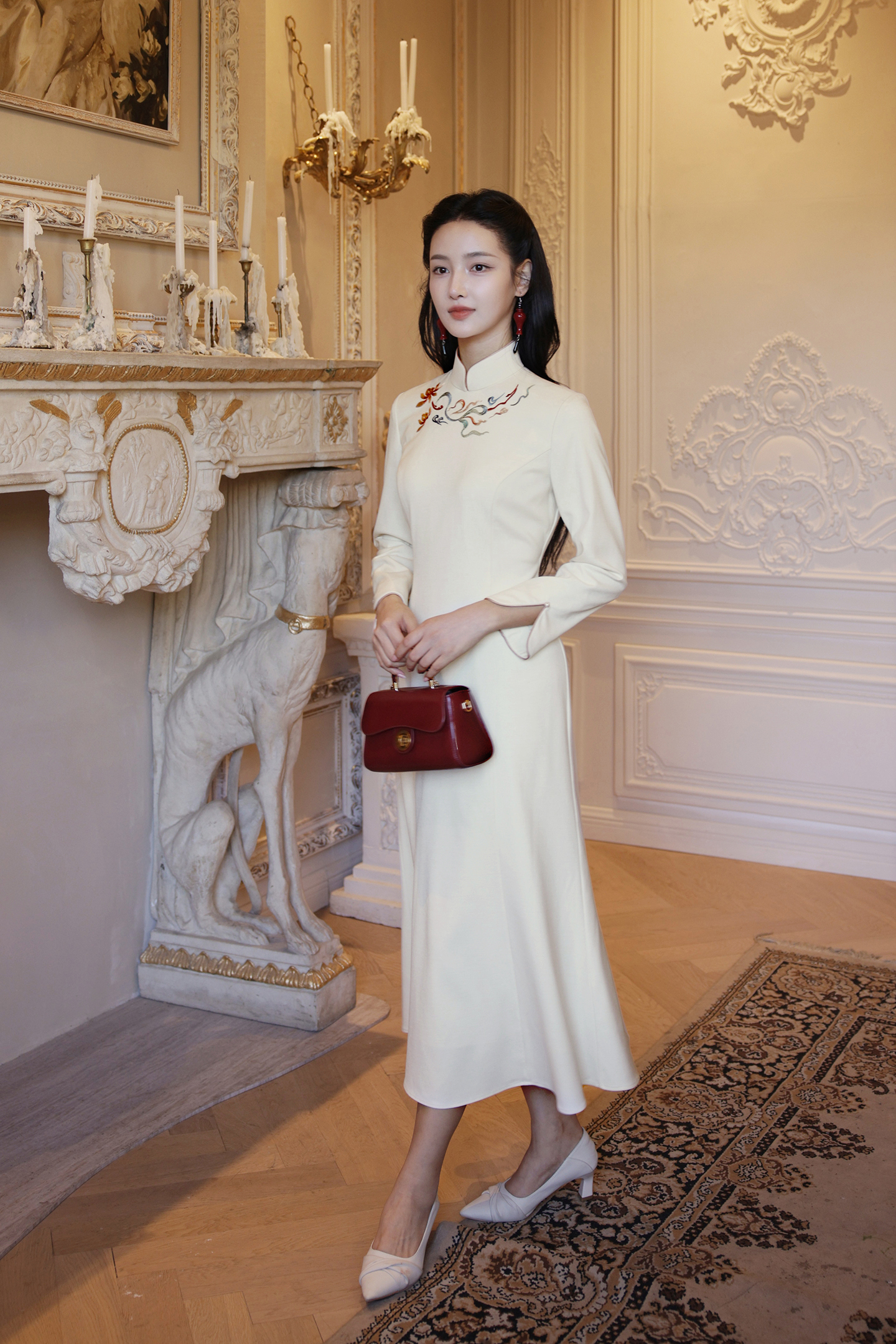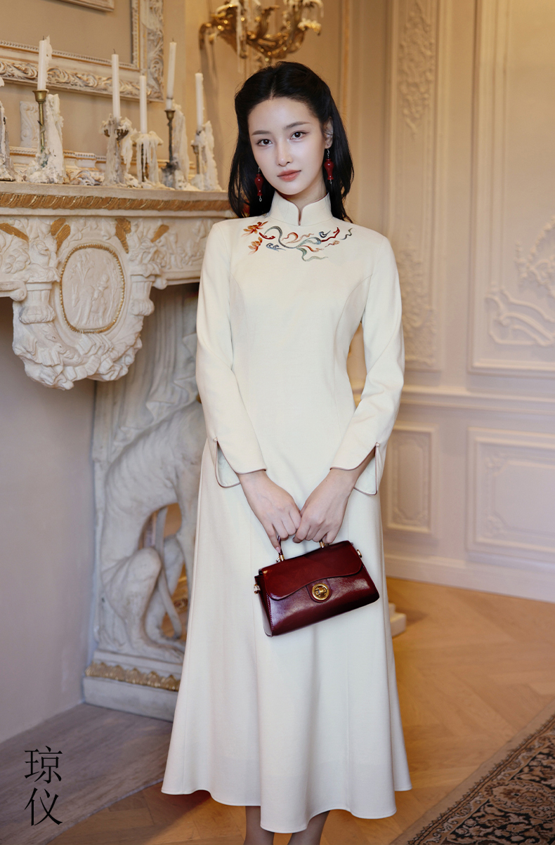 不同于超琼穿的那件旗袍,她穿的是佛头设计,我们以雅致丝带替代,普通人最好是别把佛穿在身上。这样既保留艺术神韵,亦契合我们传统佩戴习俗,让典雅与得体兼得。