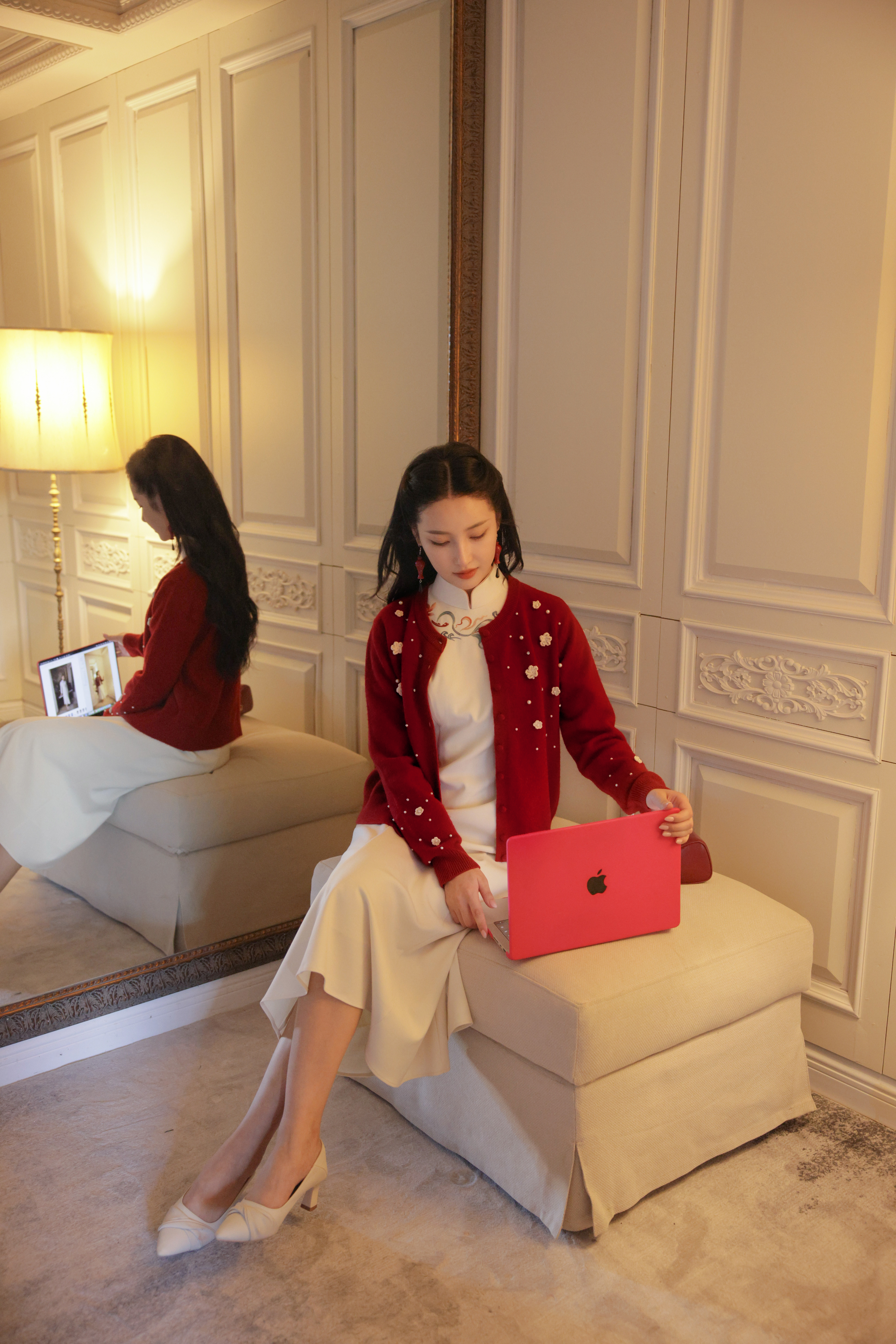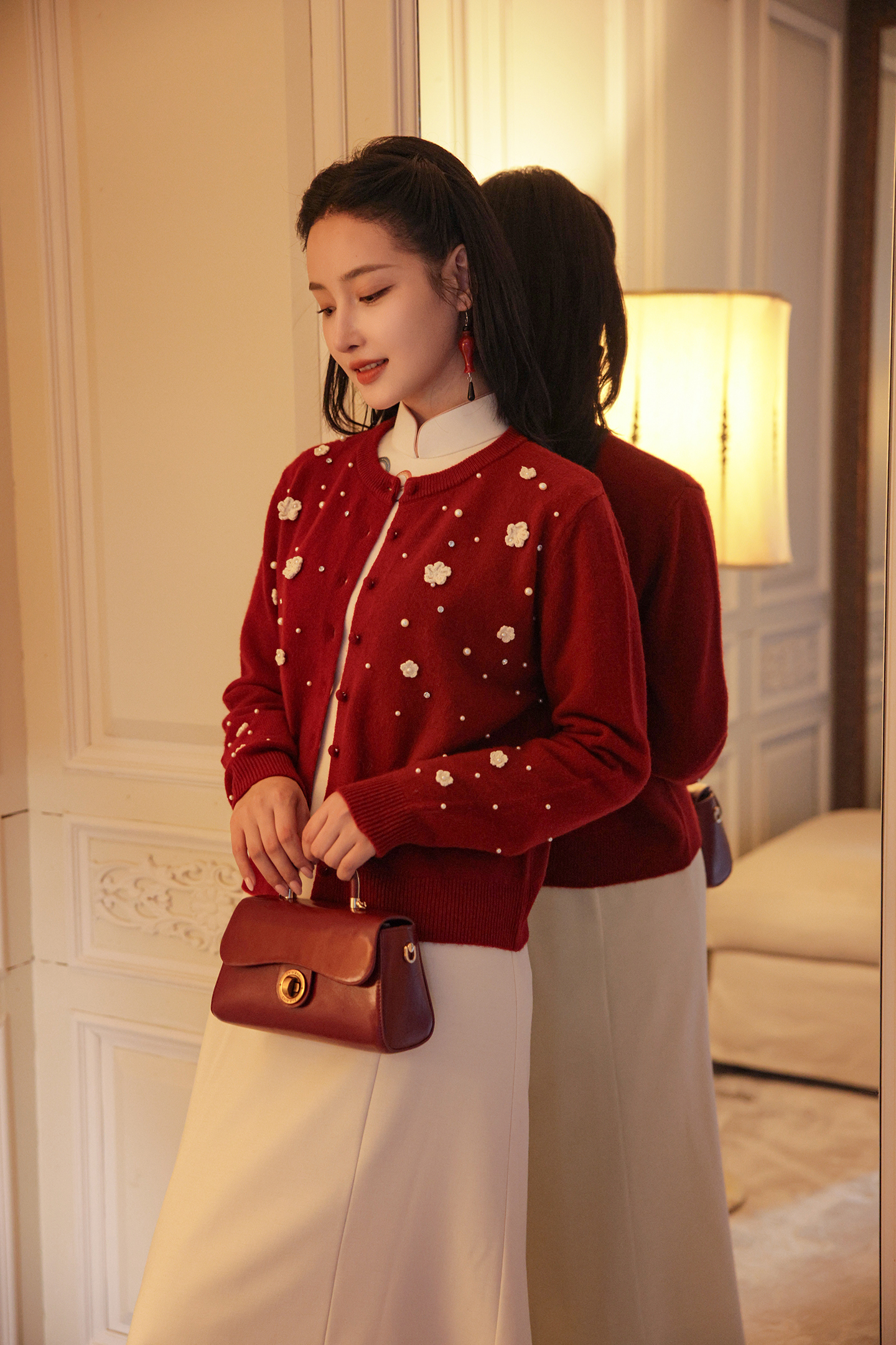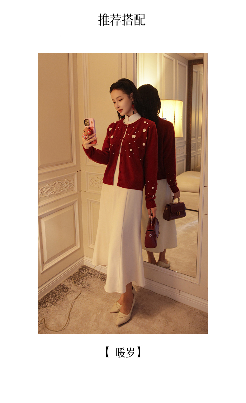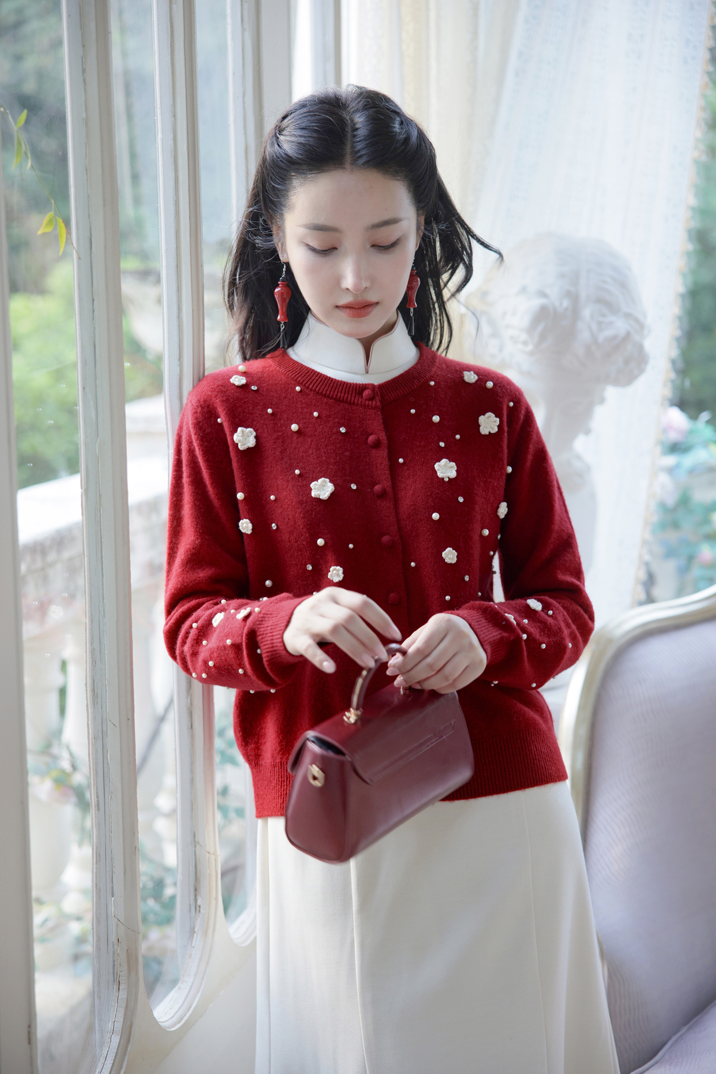 2️⃣ 开衫上散落的白色小花,悄悄和白色旗袍呼应——远看像雪点落在红衣上!