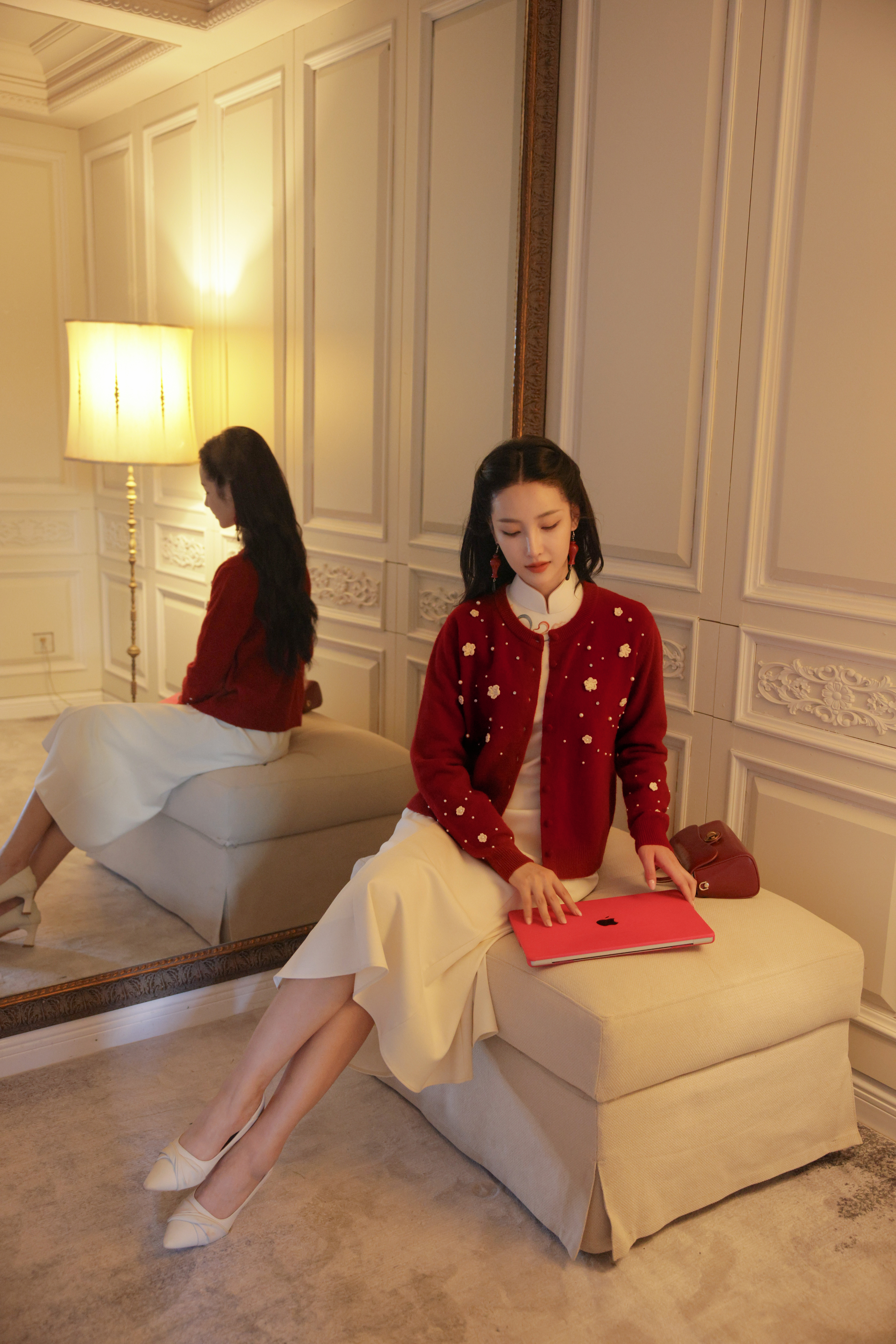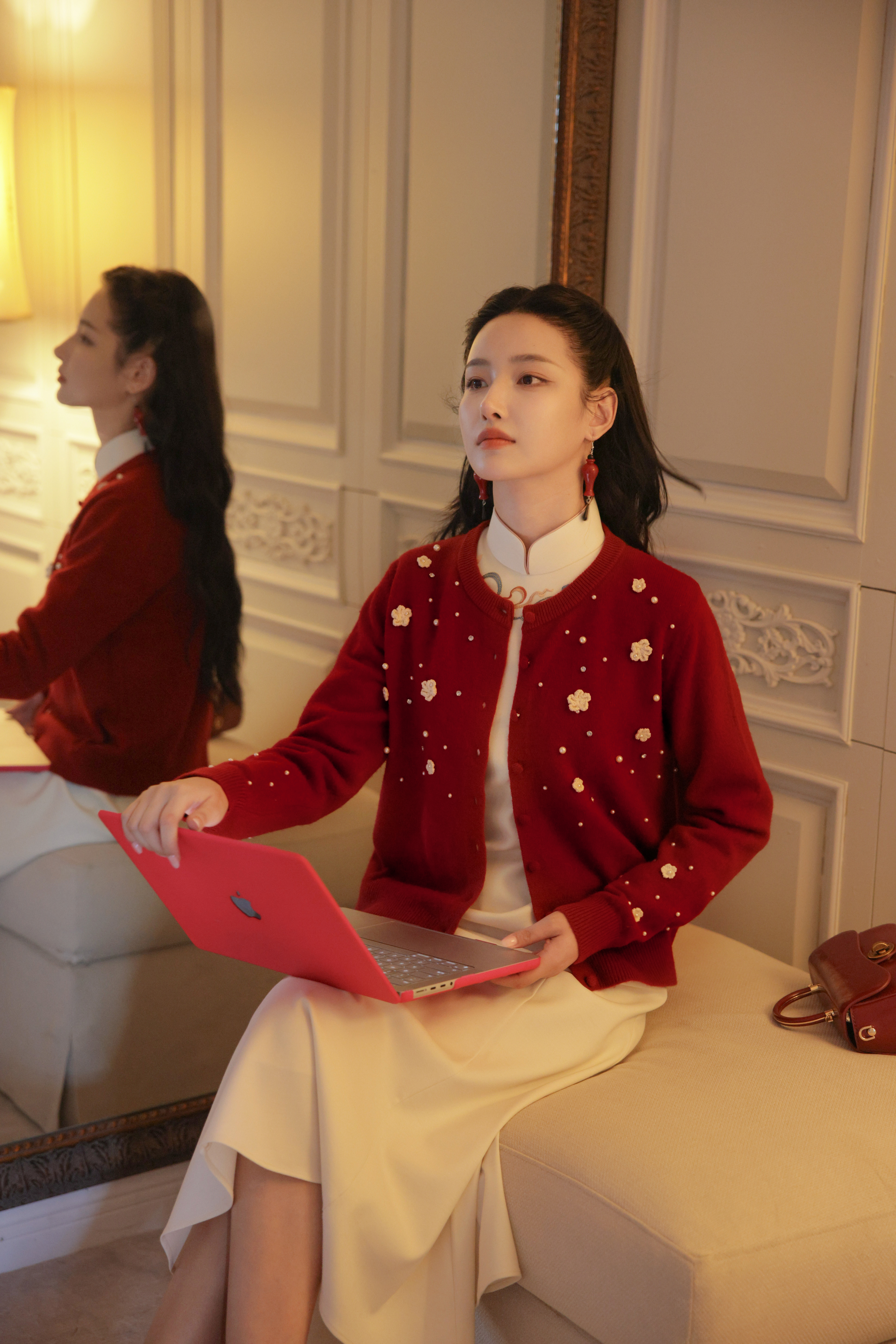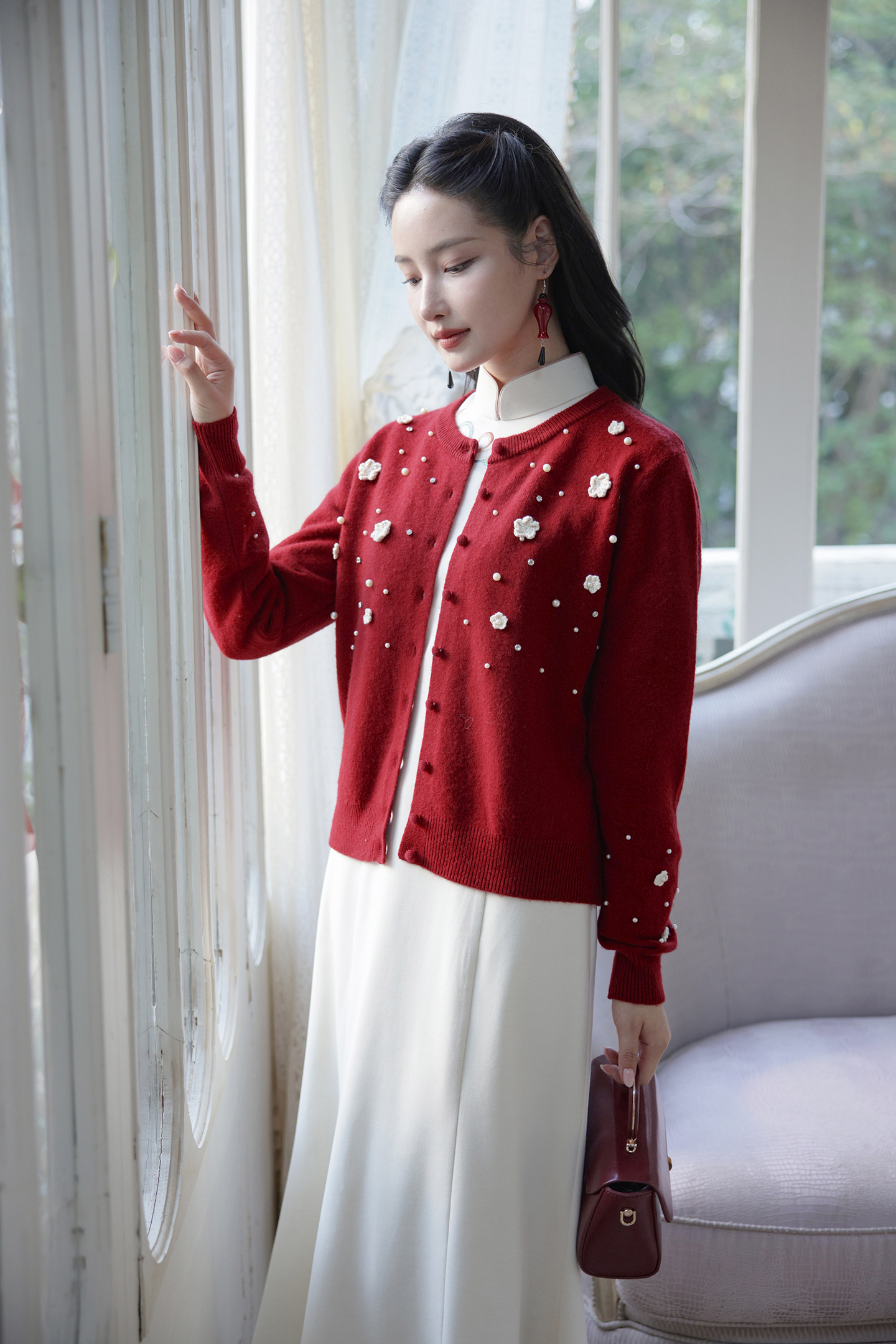 2️⃣ 开衫上散落的白色小花,悄悄和白色旗袍呼应——远看像雪点落在红衣上!