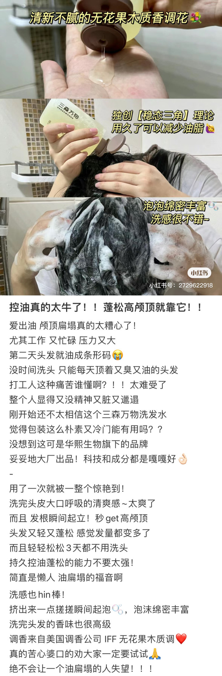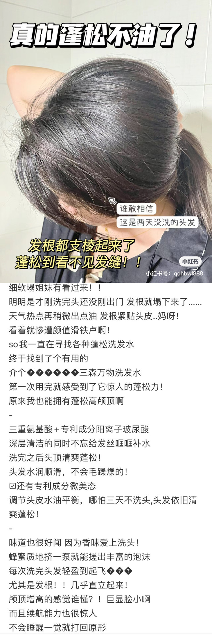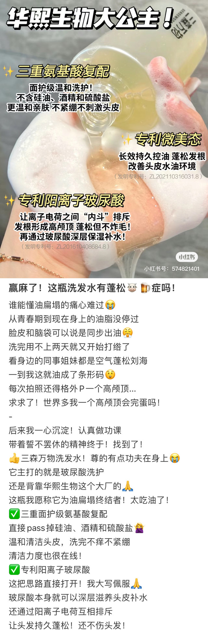 玻尿酸蓬松控油洗发水,又被叫做云感蓬蓬瓶,对大油头、头皮痒、细软发、油扁塌的发质友好,遵循"稳态三角"理论,即温和清洁+长效控油+云感蓬松三合一,打造72小时的蓬松高颅顶。在控油和补水上也兼顾得很好,三重氨基酸表活,无皂基、无硅油、无硫酸盐表活配方,洗得很干净但又不干涩;同时添加华熙生物专利科技阳 离 子 玻 尿 酸(专利号:ZL201610408684.8),会有补水和物理蓬松效果,阳离子驻留在头发之间,形成电荷互斥,从物理上拉开发丝间距,让发根持久蓬松;另外还有华熙生物重头专利微美态(专利号:ZL202110316031.8),一种益生菌发酵技术,YI制有害菌群繁殖,TIAO节皮肤微生态,从而改SHAN头皮油脂分泌和PH失衡,TI让头皮水油平衡,把保湿、控油、XIU护都做到啦!用它洗完头发吹干后,肉眼可见的更加蓬松!香味也很赞,清新悠远的无花果木质调,像是身处水气弥漫的森林中,特别放松!因为不含硅油,清洗时候会稍微有点涩,大家可以搭配它家护发素一起,洗完之后发丝就会变顺滑,也不会扁塌塌咯!