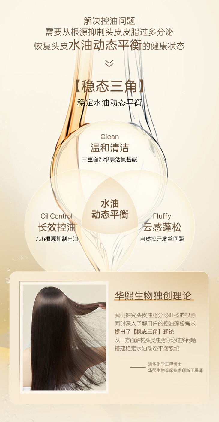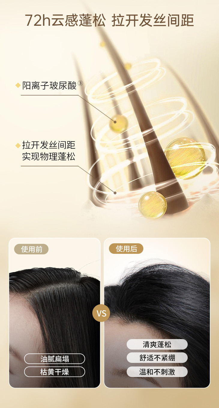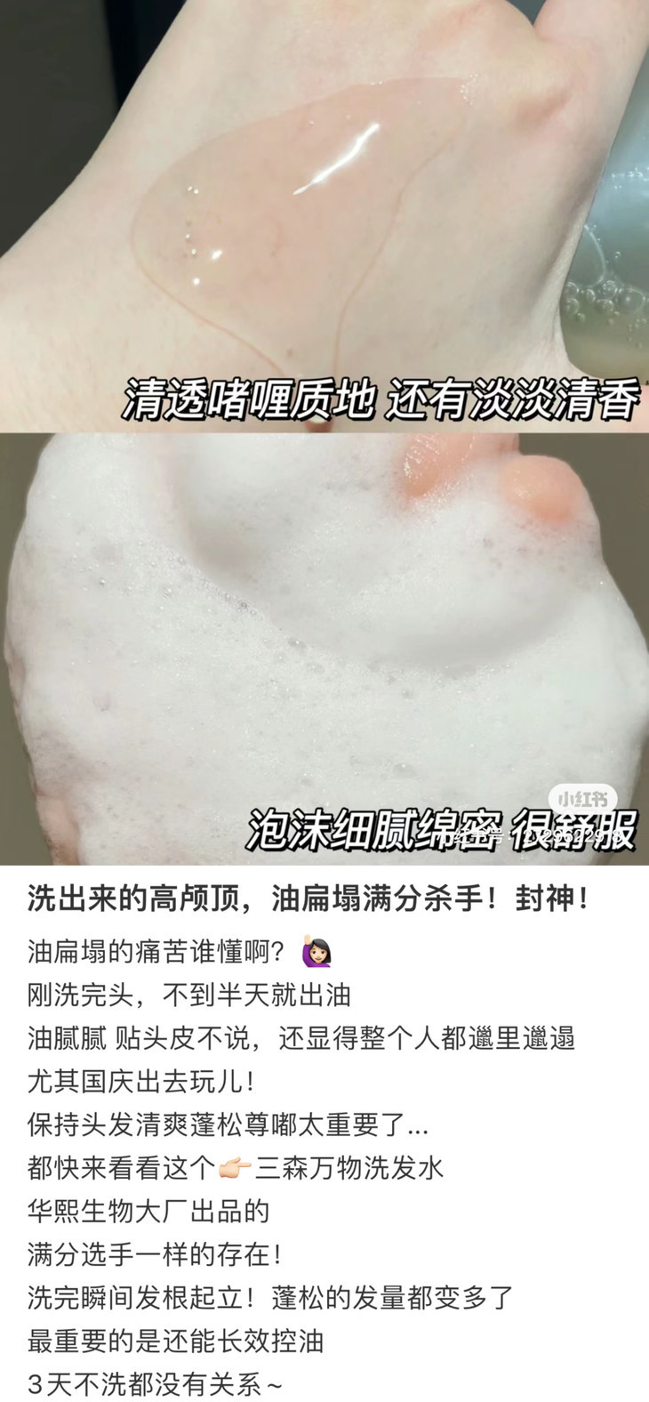 玻尿酸蓬松控油洗发水,又被叫做云感蓬蓬瓶,对大油头、头皮痒、细软发、油扁塌的发质友好,遵循"稳态三角"理论,即温和清洁+长效控油+云感蓬松三合一,打造72小时的蓬松高颅顶。在控油和补水上也兼顾得很好,三重氨基酸表活,无皂基、无硅油、无硫酸盐表活配方,洗得很干净但又不干涩;同时添加华熙生物专利科技阳 离 子 玻 尿 酸(专利号:ZL201610408684.8),会有补水和物理蓬松效果,阳离子驻留在头发之间,形成电荷互斥,从物理上拉开发丝间距,让发根持久蓬松;另外还有华熙生物重头专利微美态(专利号:ZL202110316031.8),一种益生菌发酵技术,YI制有害菌群繁殖,TIAO节皮肤微生态,从而改SHAN头皮油脂分泌和PH失衡,TI让头皮水油平衡,把保湿、控油、XIU护都做到啦!用它洗完头发吹干后,肉眼可见的更加蓬松!香味也很赞,清新悠远的无花果木质调,像是身处水气弥漫的森林中,特别放松!因为不含硅油,清洗时候会稍微有点涩,大家可以搭配它家护发素一起,洗完之后发丝就会变顺滑,也不会扁塌塌咯!