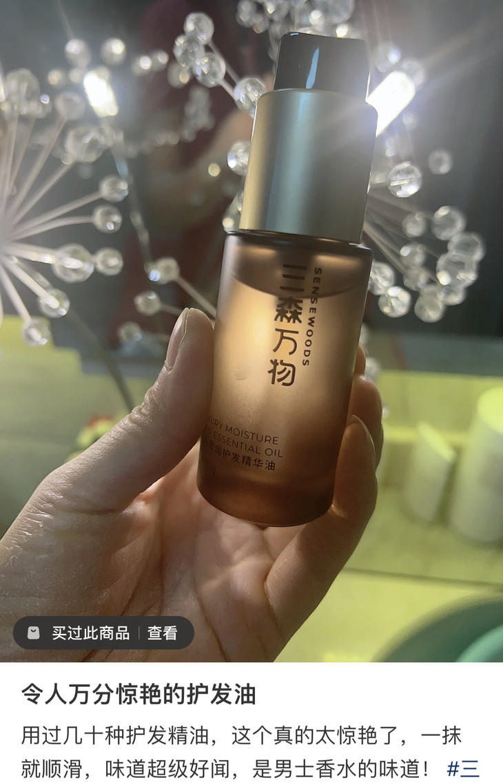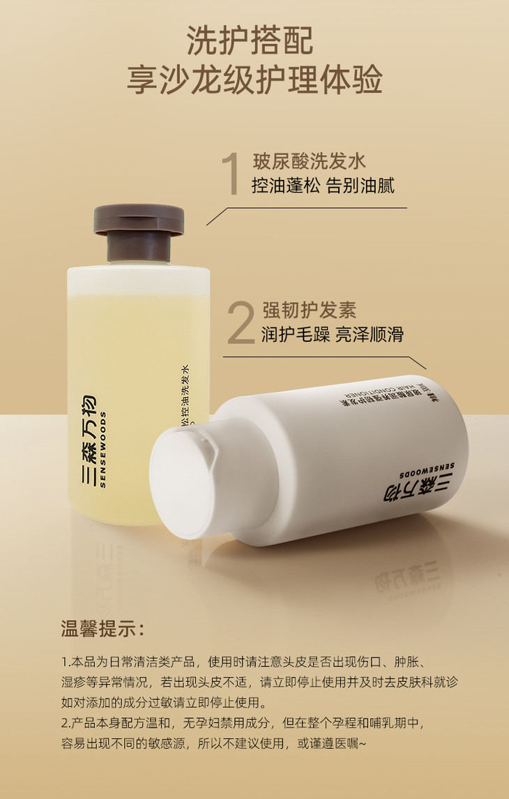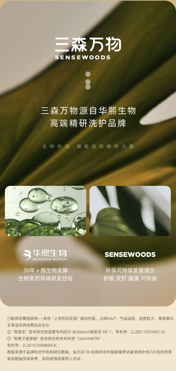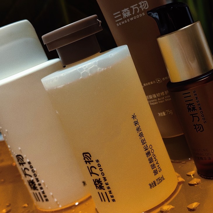 三森万物,品牌哲学源自古老的道德经,即万物起源于道,道生一,一生二,二生三,三森(生)万物,万物之「道」,在于平衡、创新、能量。而它更是国产原料大佬华熙生物旗下的高端精研洗护品牌,坚持不断创新,为国人提供品质与高效共存的个护产品与极致体验,共同追求平衡可持续的生活方式。冷解构「平衡」之美,让生物科技赋能自然力量。
