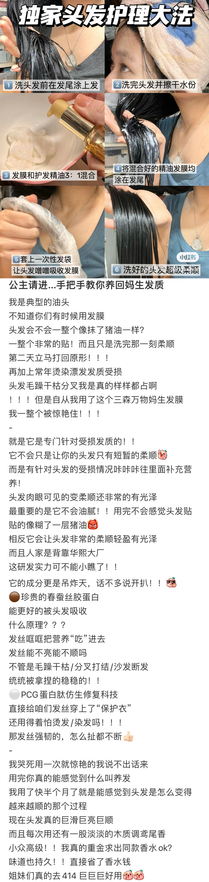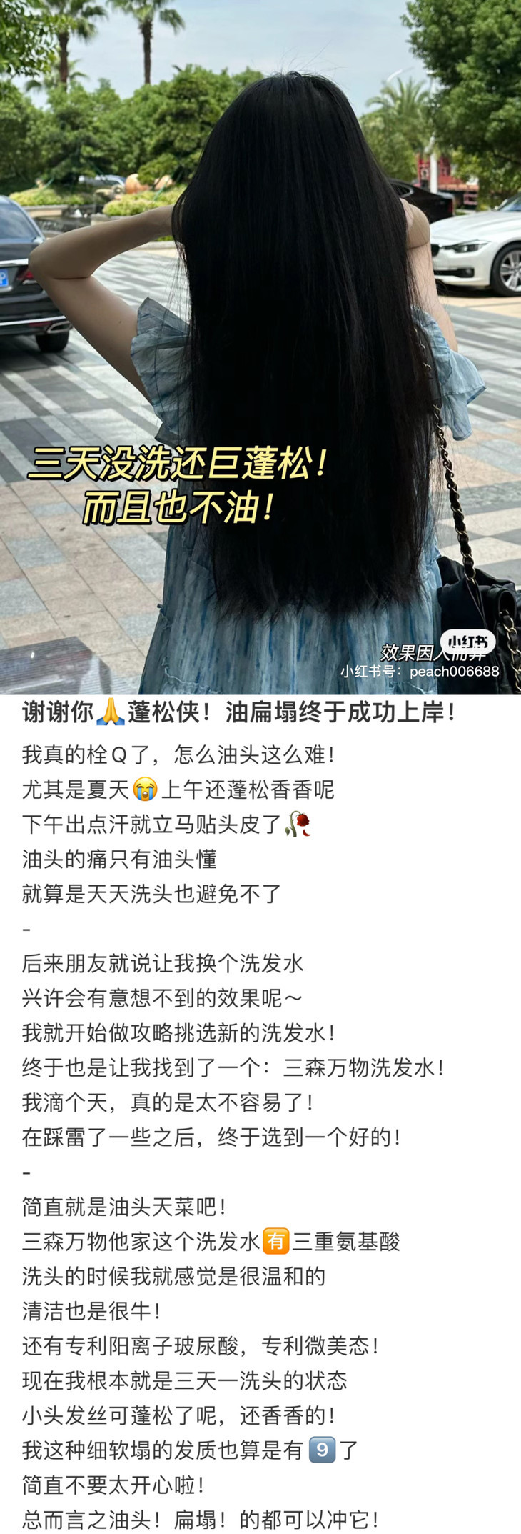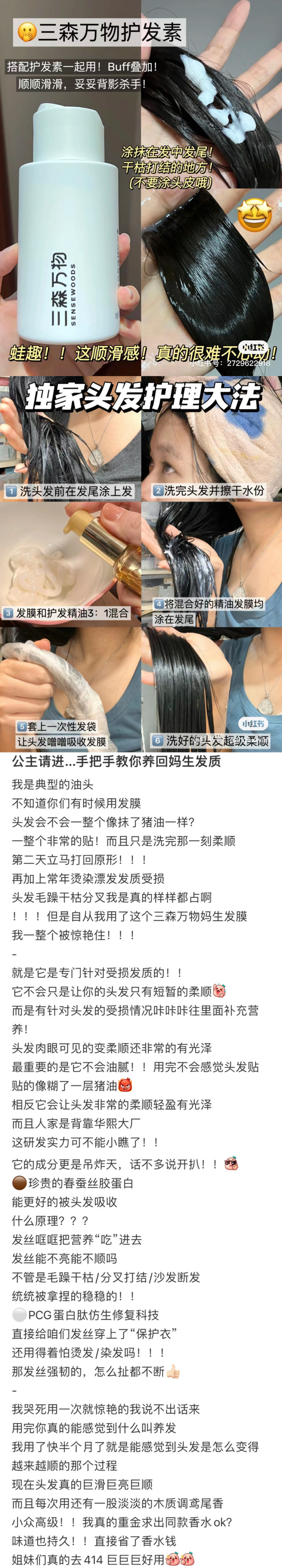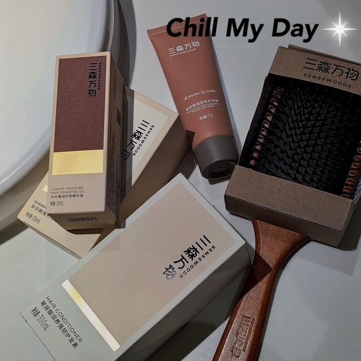 自从上了博柔后,就很少上洗发护发用品,Ayu洗发水一出,就更是没再换了,但华熙出的三森万物,还是要试试的,毕竟死忠粉。。。有一整套哦,玻尿酸蓬松控油洗发水、润养强韧护发素、护发精油和妈生发膜,我个人觉得是蛮不错的,轻爽不油腻,水润又饱满,再加上护发素和精油,头发都很柔顺乖巧,光泽度也很好,而且,香味好闻!如果没有在用Ayu和油浴的,很推荐!