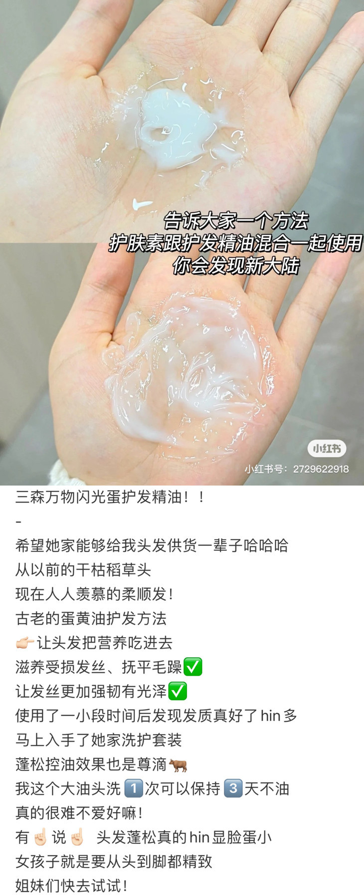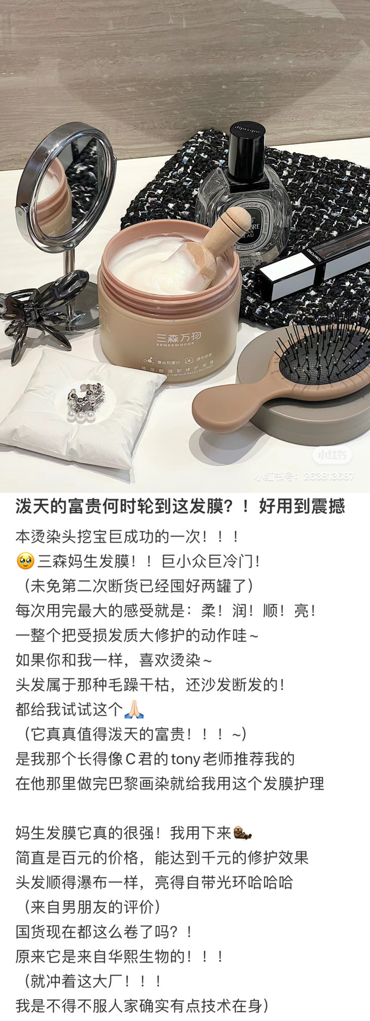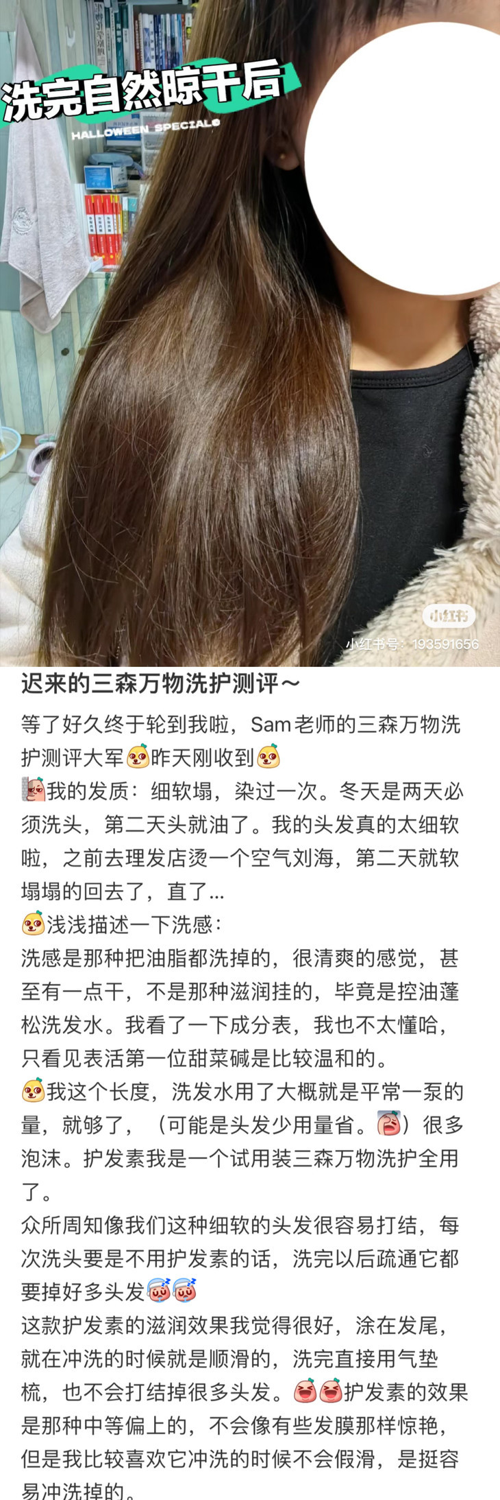 自从上了博柔后,就很少上洗发护发用品,Ayu洗发水一出,就更是没再换了,但华熙出的三森万物,还是要试试的,毕竟死忠粉。。。有一整套哦,玻尿酸蓬松控油洗发水、润养强韧护发素、护发精油和妈生发膜,我个人觉得是蛮不错的,轻爽不油腻,水润又饱满,再加上护发素和精油,头发都很柔顺乖巧,光泽度也很好,而且,香味好闻!如果没有在用Ayu和油浴的,很推荐!
