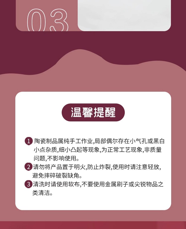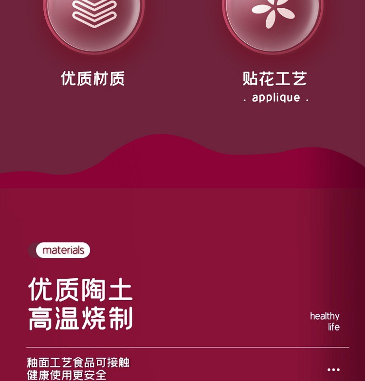 特点:精选优质陶土,高温烧制,釉面工艺食品可接触,