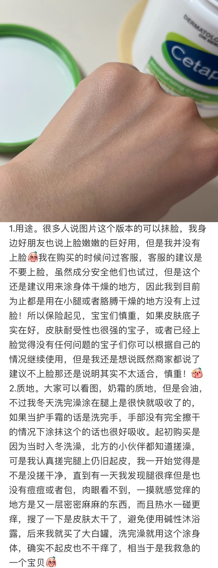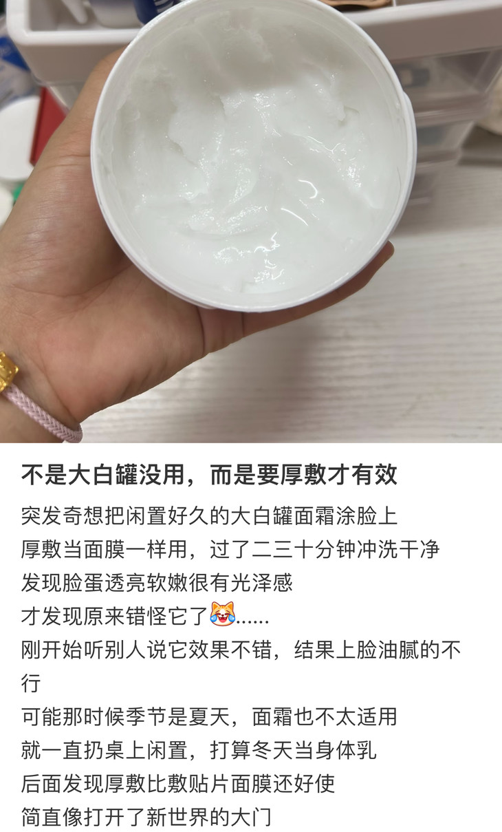 大白罐的质地更是要夸爆!像是绵柔的冰淇淋,轻轻一揉就化开,延展性也超棒,瞬吸,完全不会有黏腻的猪油感,很水润,光泽度也很好。当身体乳当面霜,肤感都特别柔和,补水保湿又不刺激。而且,足足550g的大容量哦,厚敷当面膜手膜脚膜都不心疼,甚至能当唇霜,一家老小都能用!老人手脚皴裂能用它深度滋润,孕妈妈保湿无负担,宝宝的娇嫩肌肤也能靠它安心呵护!敏肌也可一试!