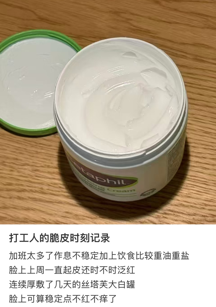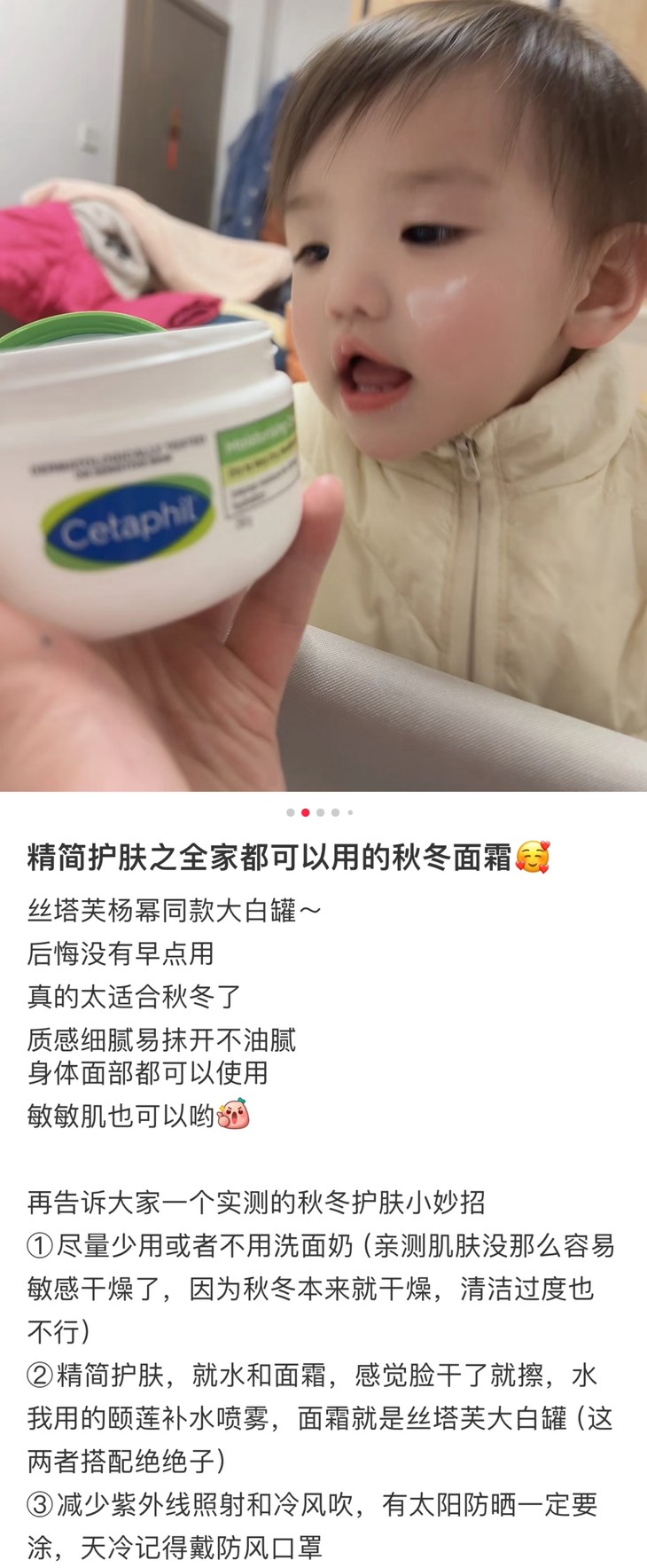丝塔芙大白罐,是老粉要求的哦,上上!主要是秋冬容易干燥起皮粗糙掉屑,尤其是小孩子,角质层薄,锁水能力弱,一冷一热就会泛红干痒,小脸蛋干巴巴。。。我一般会推荐万能霜和Ayu的油膏和小绿乳,雪玉也不错,但,大白罐确实更性价比,89.9元就有550g的大容量,全身上下,家中老小,薄涂厚涂都合适,温和又能打!