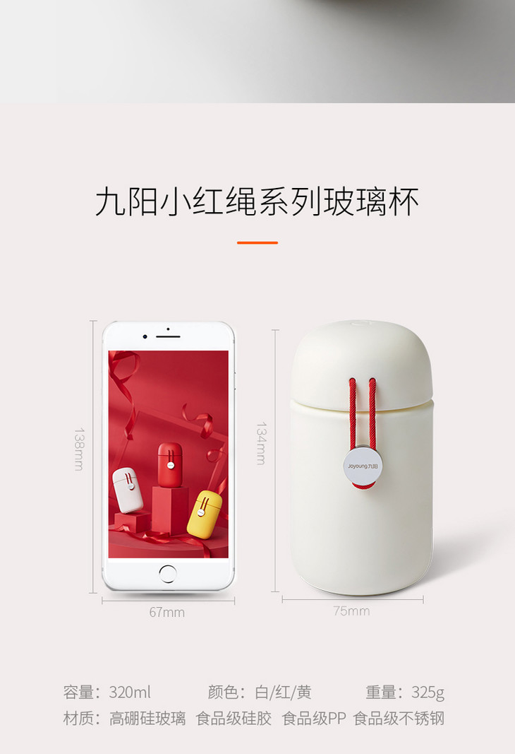 红绳在手,幸运相随!美好的祝福,送给亲人、朋友和自己。这款小红绳玻璃杯采用婴儿奶瓶级高硼硅玻璃,冷热皆宜,适合盛装各类饮品,全身无缝设计,婴儿肌手感,具有一定防烫抗摔效果,耐用更安心,便携红绳提手设计,精良纺织工艺,设计感与实用性并存。