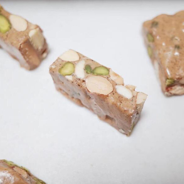 咖啡味选用鱼缸独家咖啡豆“lucky shot”的浓缩咖啡和咖啡粉制作,咖啡豆自带的“巧克力香气、烤焙坚果、可可余韵”这些风味给牛轧糖带来了丰富的口味层次。毫不手软的添加了超多坚果,慢慢咀嚼每一口都是不同的惊喜。
