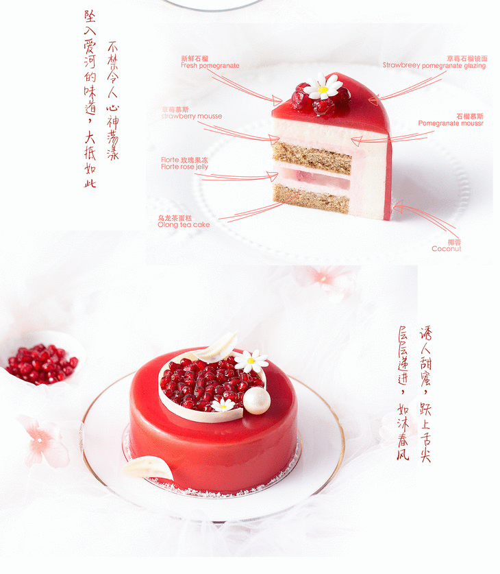 稀奶油、鲜鸡蛋、白砂糖、草莓果茸、石榴果茸、奶油、小麦粉、黑乌龙茶、澄面、玫瑰利口酒、玫瑰花