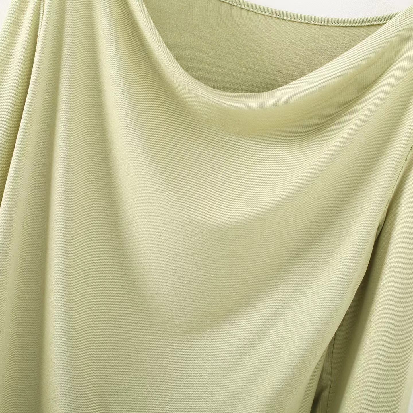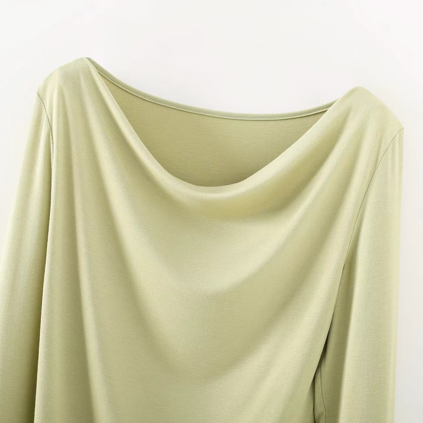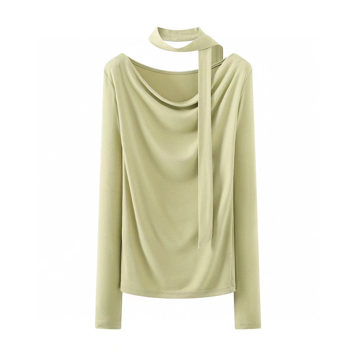 2026春季新款荡领T恤休闲长袖修身飘带上衣套头纯色,抹茶绿飘带荡领打底衫 | 温柔氛围感天花板。荡领+飘带设计:慵懒堆堆领自然垂坠,颈部飘带可系可散,打造灵动层次感,修饰颈部线条超绝。挖肩露颈小心机:后颈镂空搭配挂脖设计,打破基础款单调,甜酷氛围感拉满。修身显瘦剪裁:侧边自然褶皱藏肉不紧绷,贴合身形却不贴肤,勾勒曼妙曲线。采用高弹莫代尔混纺面料,软滑亲肤如云朵般触感,透气不闷汗,贴身穿巨舒服。垂坠感满分,不易起球变形,机洗也能保持版型。