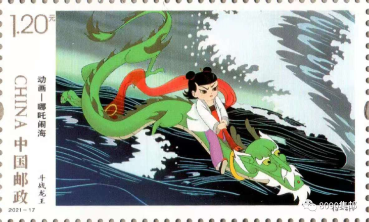 邮票画面表现了,哪吒拦截欲上天告状的龙王,并最终龙王搏斗在一起的情景。