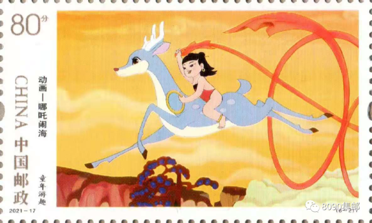 邮票画面表现哪吒和小鹿玩乐的情景,体现哪吒的童真可爱。