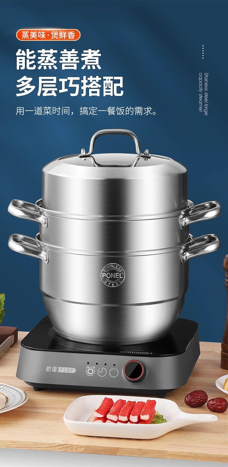 万物皆可蒸~【PONEL派能304不锈钢三层蒸锅28cm】三层容量!上可蒸下可煮,一锅多用,可以大大提升烹饪效率。蒸、煮、炖、熬样样通~电磁炉,燃气炉,电陶炉通用,新鲜的食材必须要用一口好锅呀!