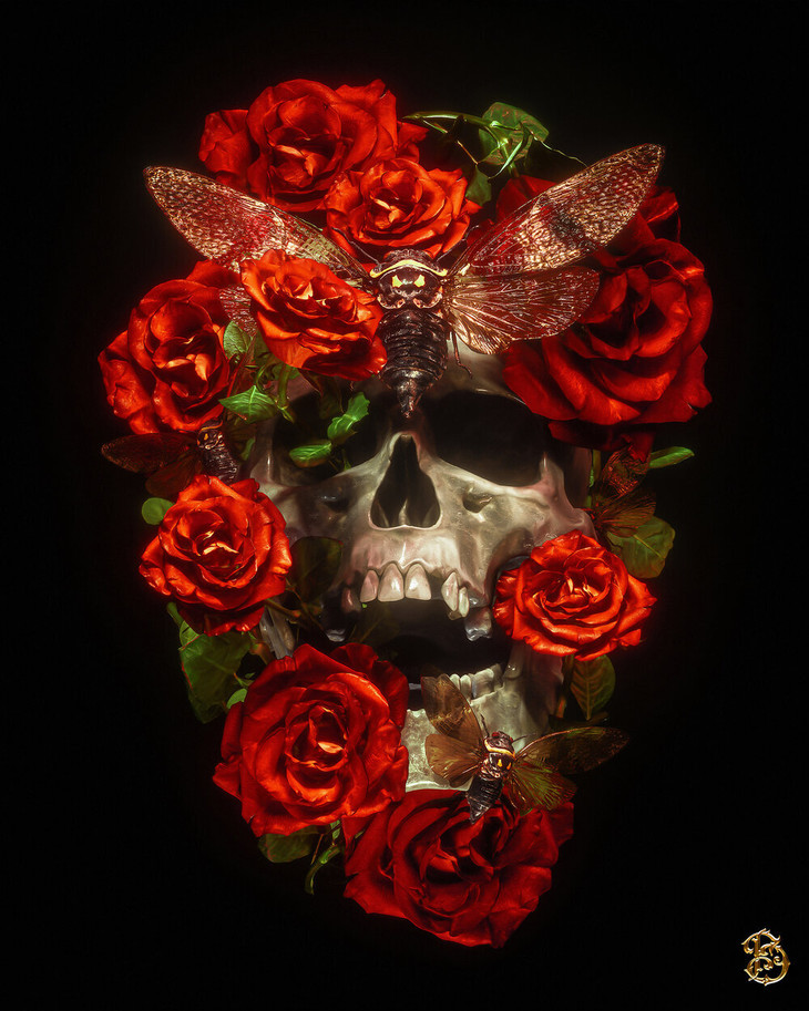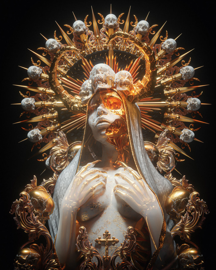 Billy Bogiatzoglou,自由3D插画师,目前居住在英国。专门从事黑暗视觉和装饰艺术。他作品的风格可以看作为是古典主义、洛可可艺术、哥特主义与超现实主义的结合体。在他的作品中,常见的元素有金色、头骨和玫瑰。