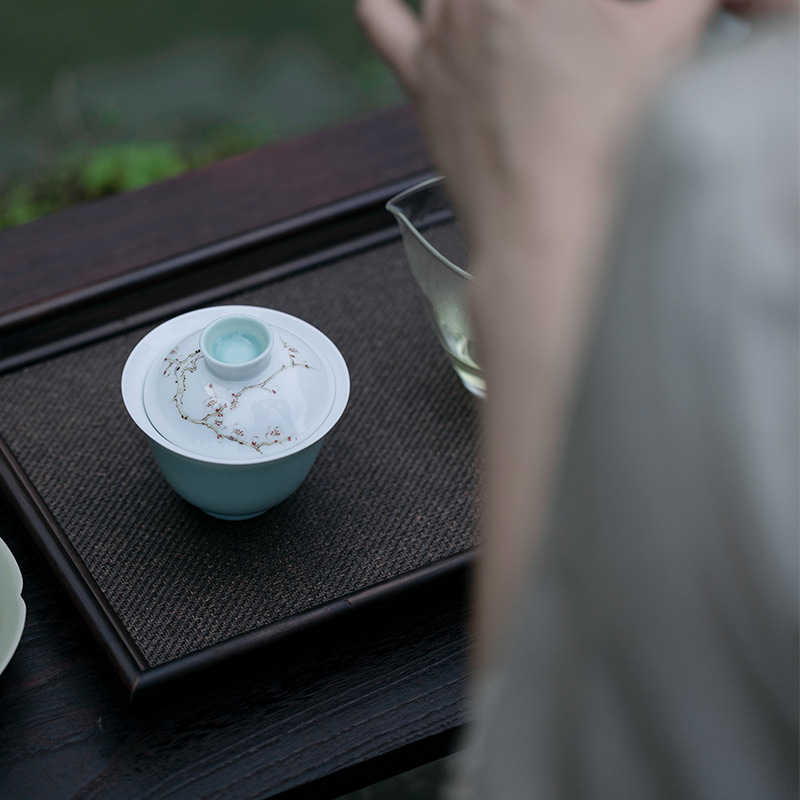 永利汇无落景德镇精工釉下手绘探幽梅花慕言盖碗手工薄胎不烫手