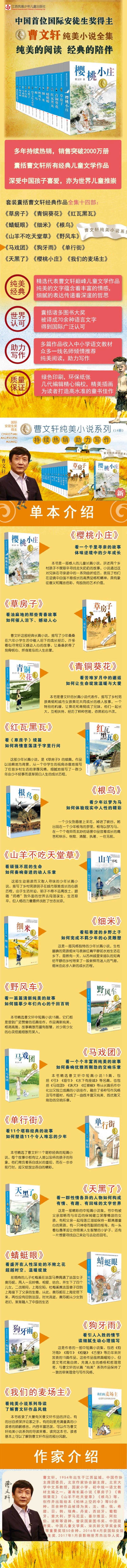 本礼盒含14部曹文轩代表作品,分别为《草房子》《青铜葵花》《蜻蜓眼》《红瓦黑瓦》《根鸟》《山羊不吃天堂草》《细米》《樱桃小庄》《我们的麦场主》《单行街》《狗牙雨》《天黑了》《野风车》《马戏团》,具有极高的文学价值和收藏价值。