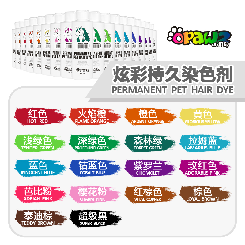 OPAWZ炫彩持久染色剂以其艳丽、时尚和独特的效果令您的爱宠在同伴中脱颖而出,温和无刺激,能持续20次左右水洗。染色效果可能会因毛发类型和宠物品种的不同而不同。十多款流行颜色,既可以互相混合,也可以配合稀释膏创造出无穷无尽的颜色,只要您想就能为您实现独一无二的色彩杰作。