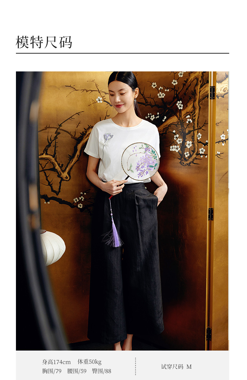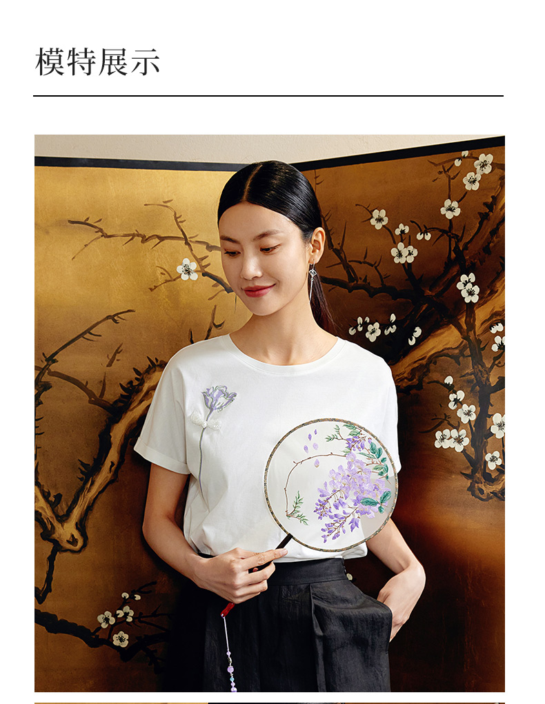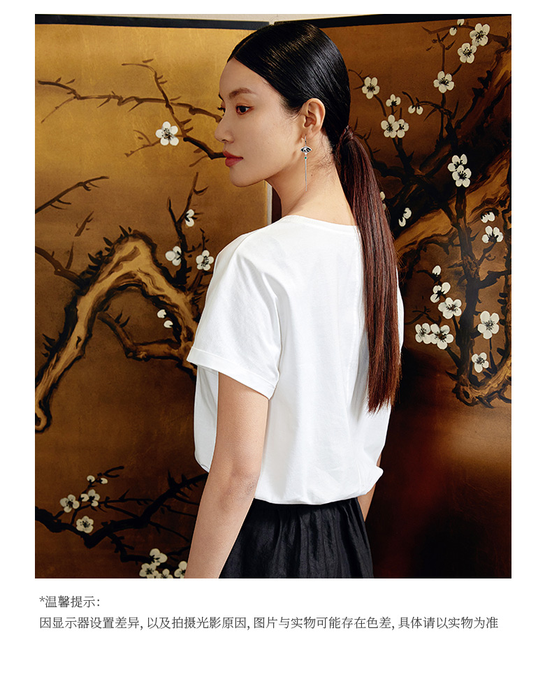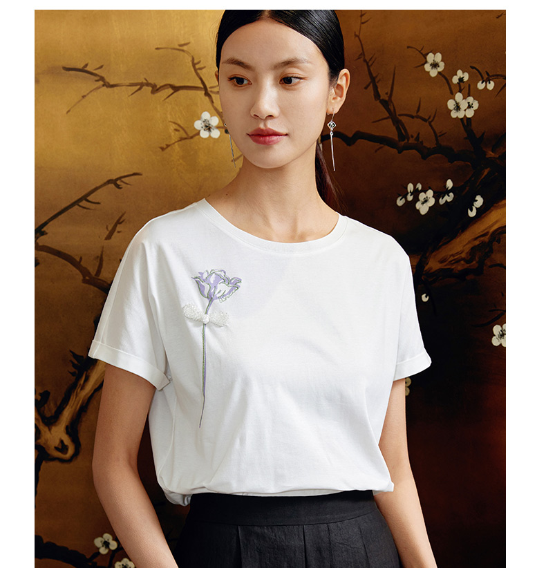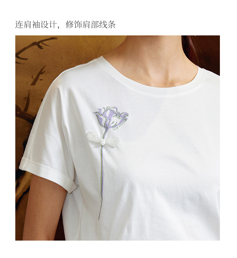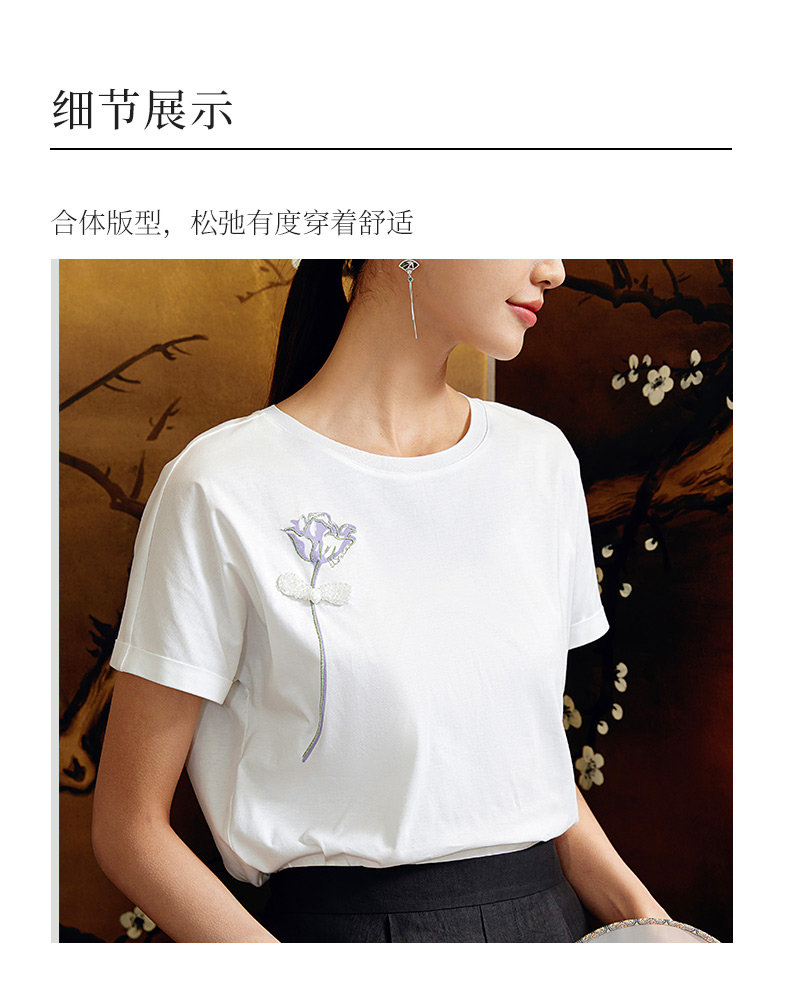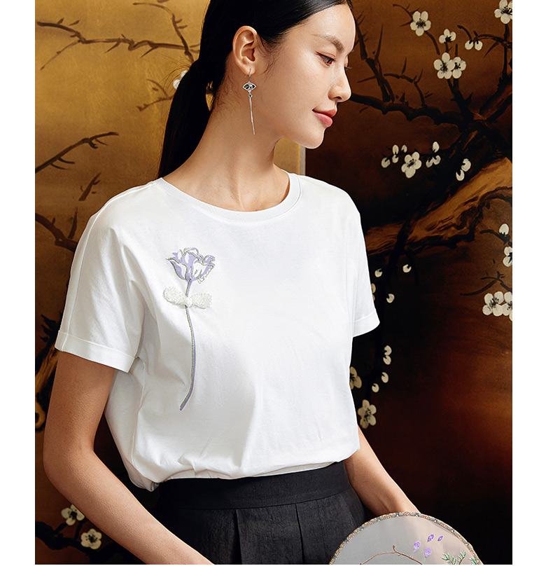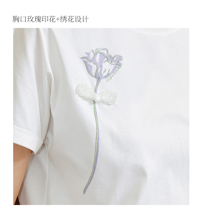 玳莎绣花印花设计感圆领白T恤女2024夏季新款时尚连肩袖短袖上衣 EB32103