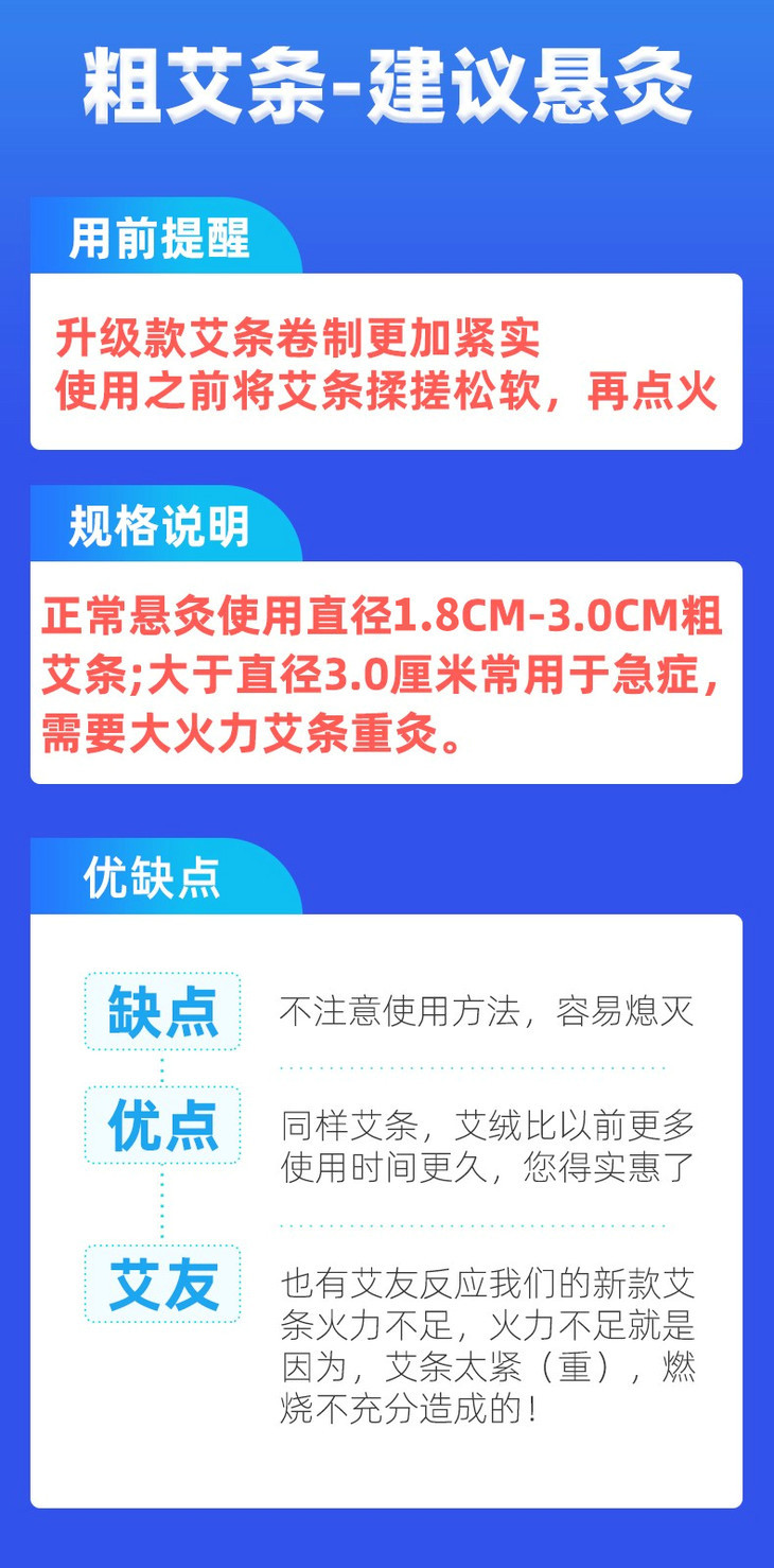 也有艾友反应我们的新款艾条火力不足,火力不足就是因为,艾条太紧,燃烧不充分造成的!你只需点火之前,把艾条捏软,问题就解决了!