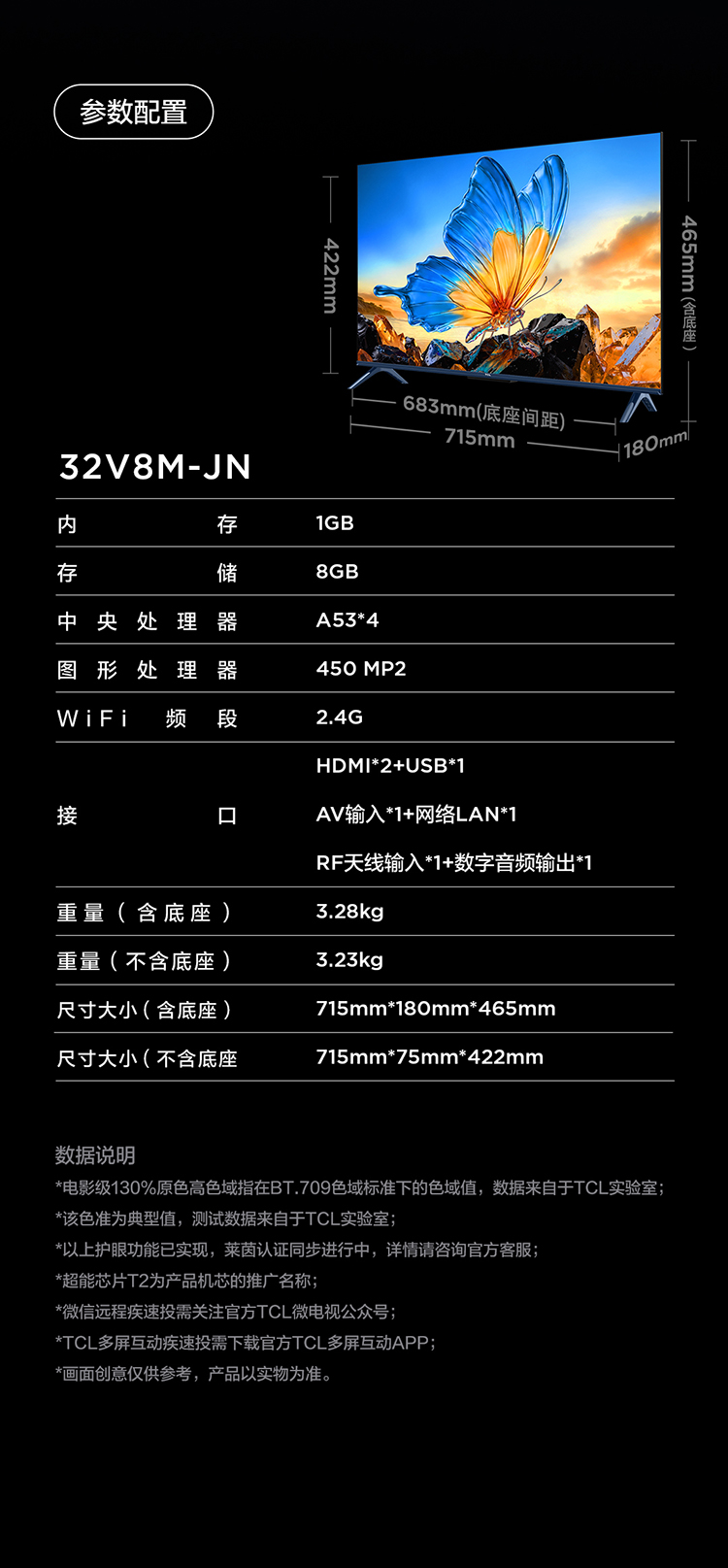 【2026款】TCL电视 32V8M-JN 32英寸 高色域 1GB+8GB大内存 护眼 投屏电视