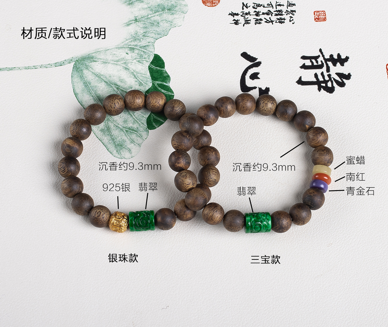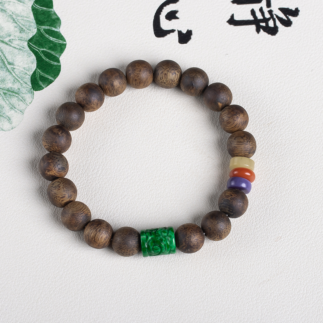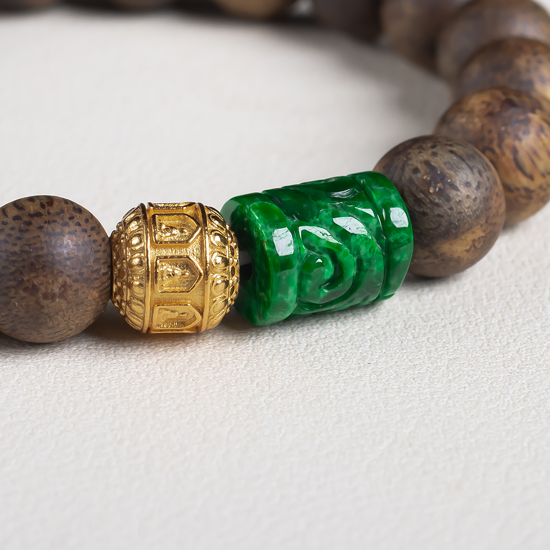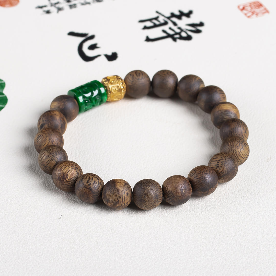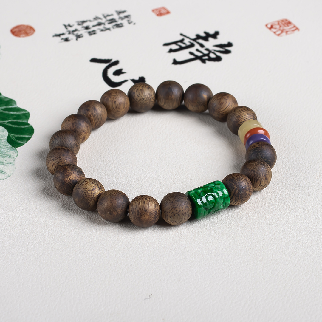 xy0655沉香+翡翠手串,天然沉香,原色原味,香味自然清甜,辣绿复古雕刻的翡翠桶珠、文玩三宝,款式古典大方。