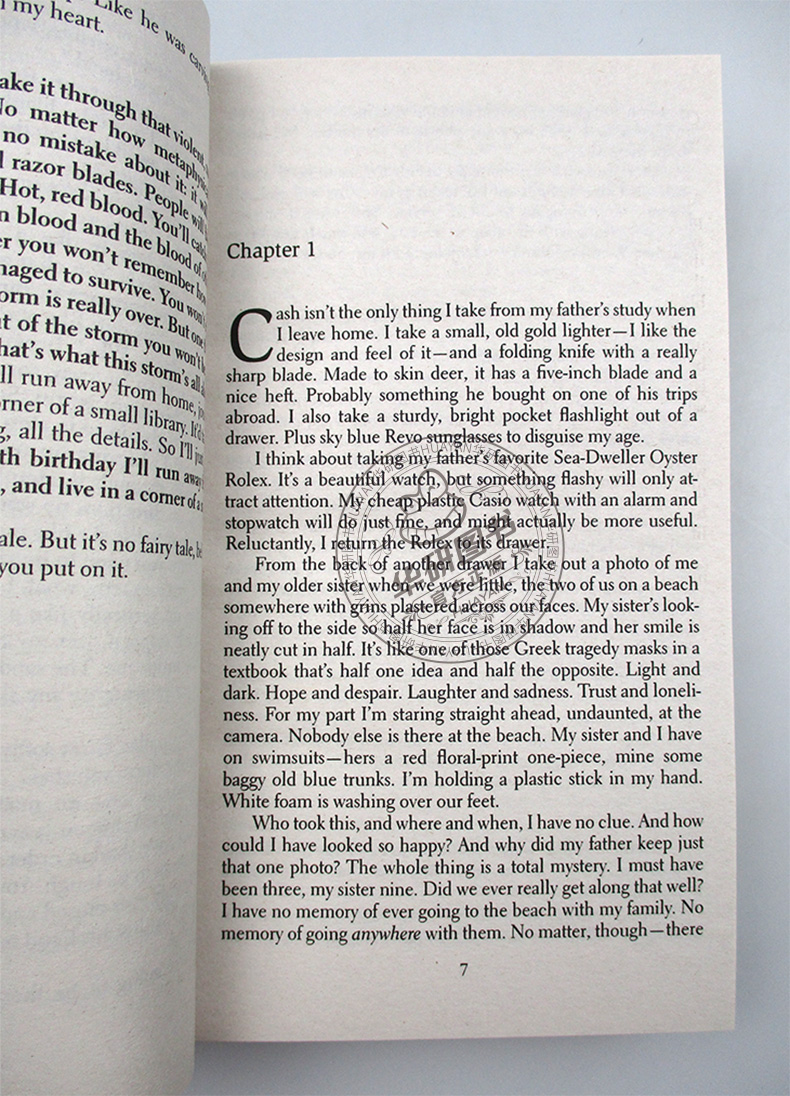 She sits there on her yellow suitcase, notebook in hand, giving it some thought. “Hmm... that's a kind of philosophy, isn’t it. Not such a bad way of thinking about life. Sort of a reincarnation, New Age kind of thing. But, Kafka, remember this, okay? I don’t go around giving my cell phone number to just anybody. You know what I mean?”