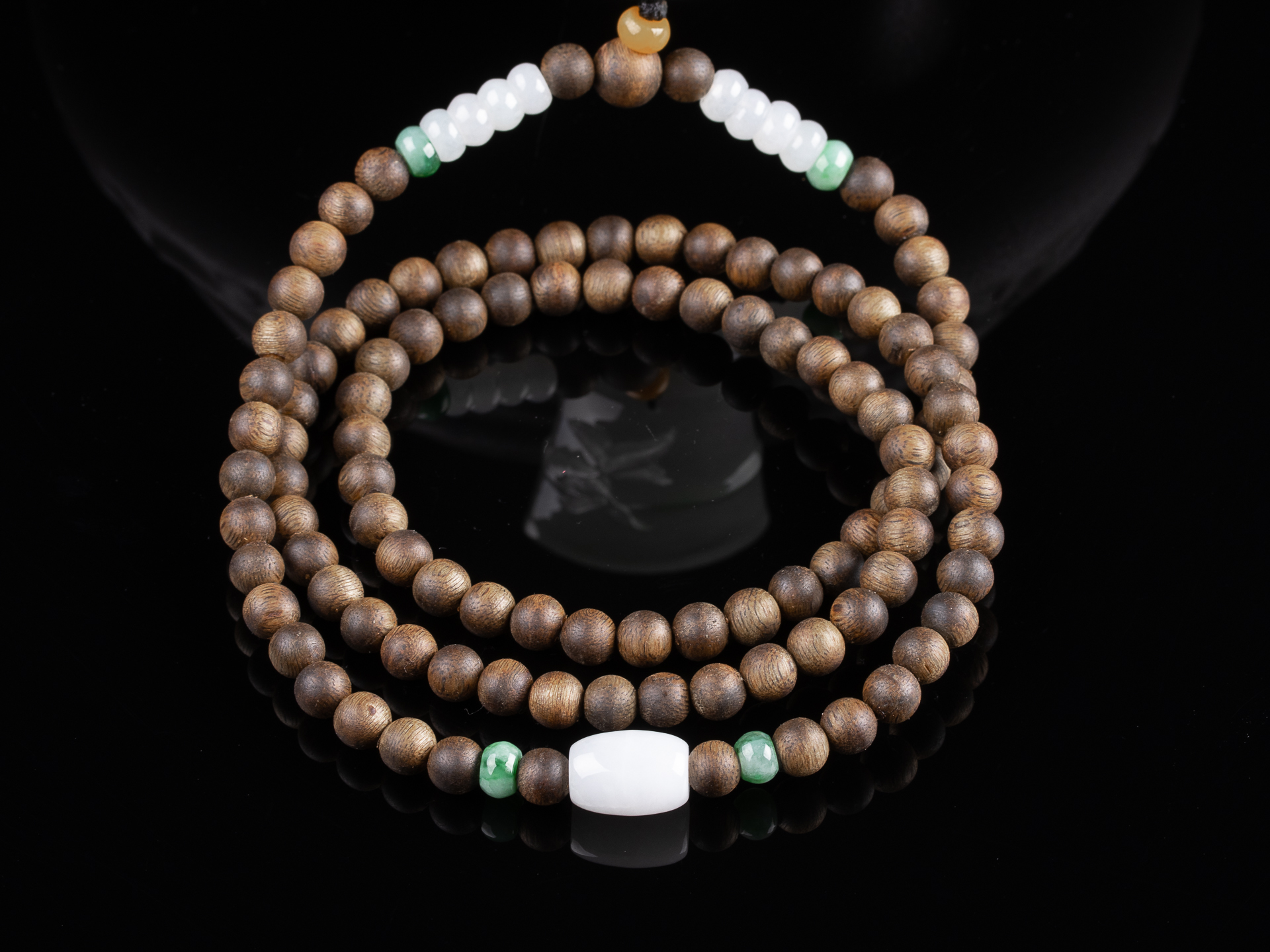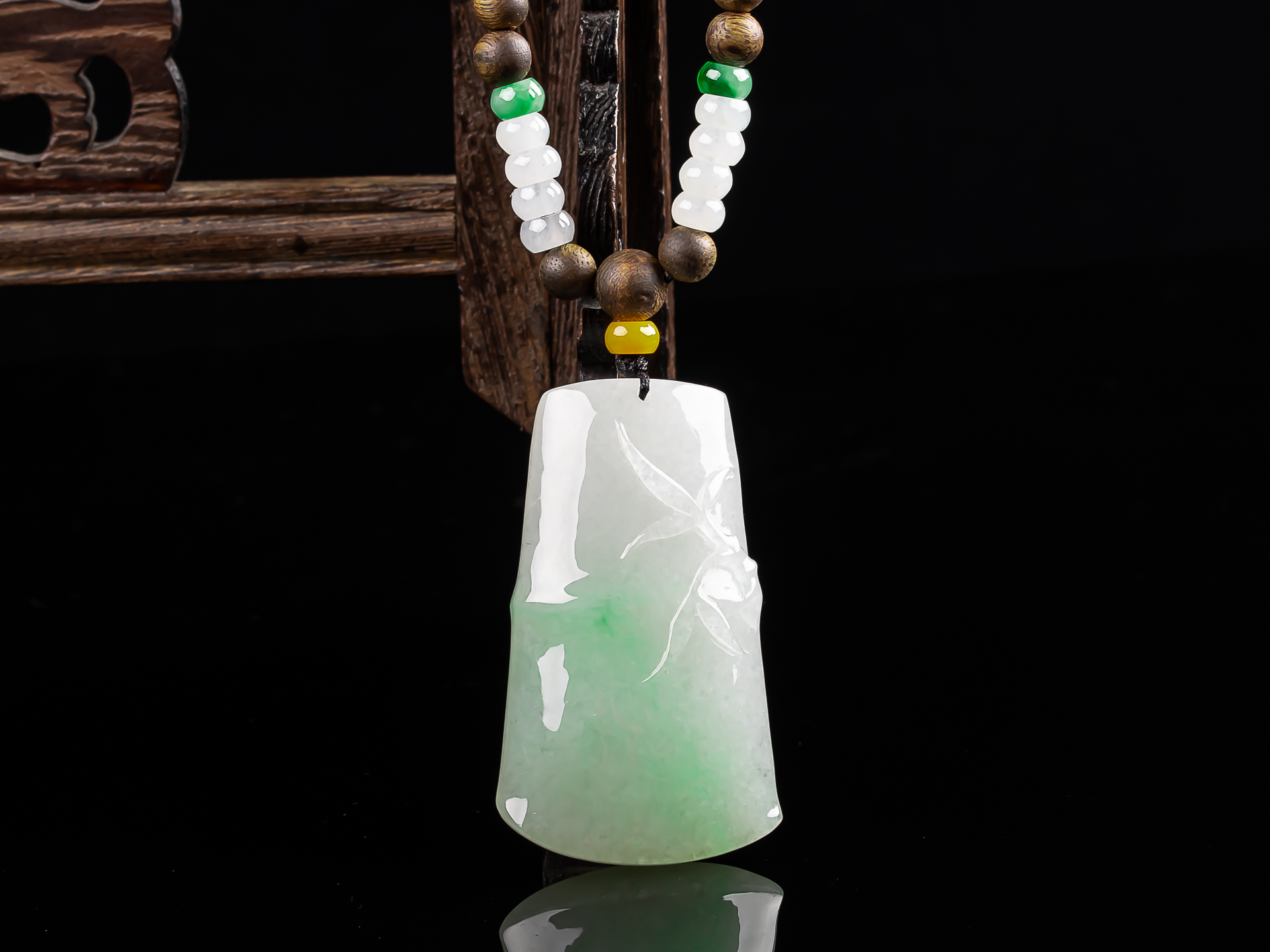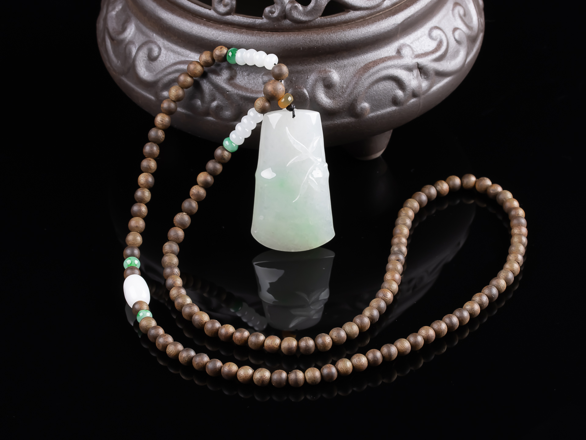 沉香diy飘色翡翠大竹节挂件,沉香圆珠约6.3mm,链子总长33cm,原色原味,香气自然清甜,配珠:翡翠。冰种飘翠色的大竹节,约54.2*32*10.3mm,桶珠搭配,寓意竹报平安,步步高升!