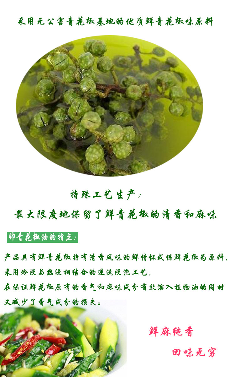 本品精选公司自建无公害基地的鲜青花椒为原料,运用现代纯生物浸提方法配合先进调配技术精制而成,不使用任何食品添加剂和防腐剂,较完整地保留了九叶青鲜花椒固有的香气和麻味,具有麻味适宜,香气清爽的特点.
