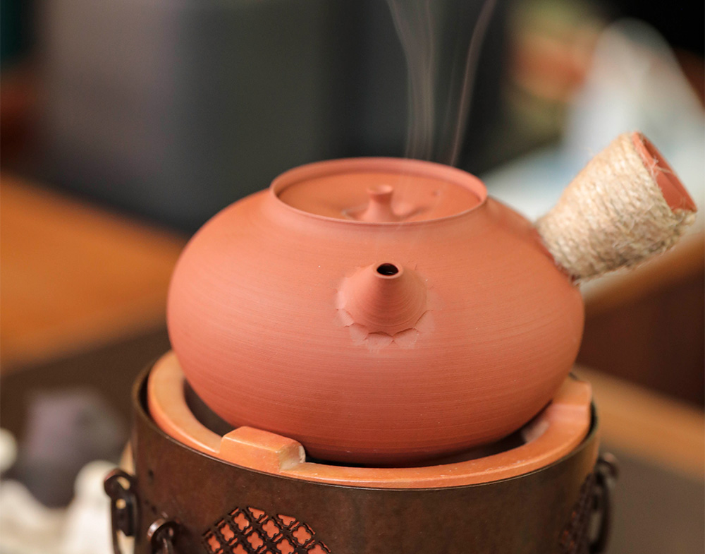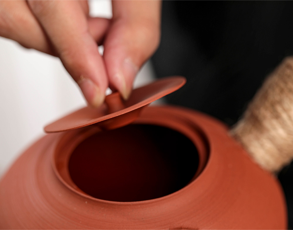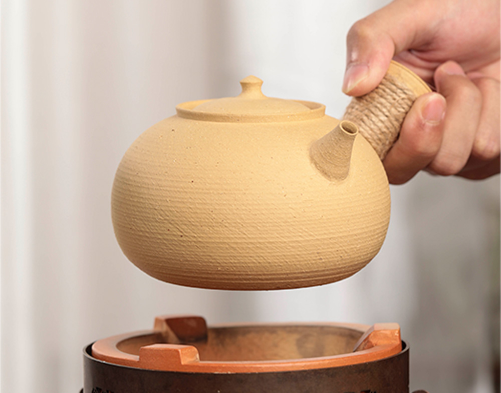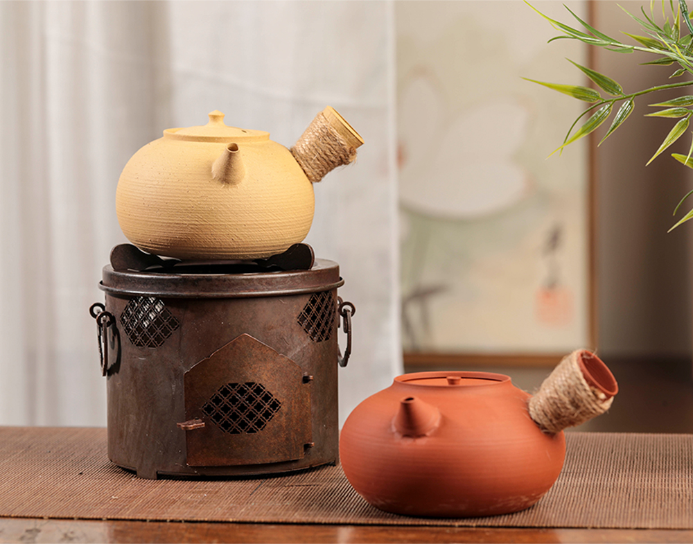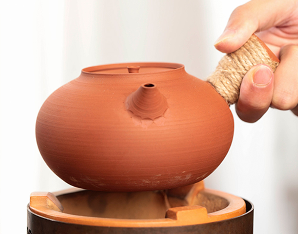 当然,由于这两款砂铫非常的轻薄,所以清友们需要注意无论我们是用电陶炉还是红泥炉烧都要把砂铫拿下来加水,注意不要干烧噢!这会让砂铫破裂的,烧水的时候不要让壶嘴、壶盖上的出气孔和壶钮处于一条直线。