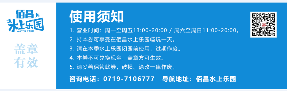 1.持本券可享受在佰昌水上乐园畅玩一天,仅可入园一次,每张团购券限一人使用;